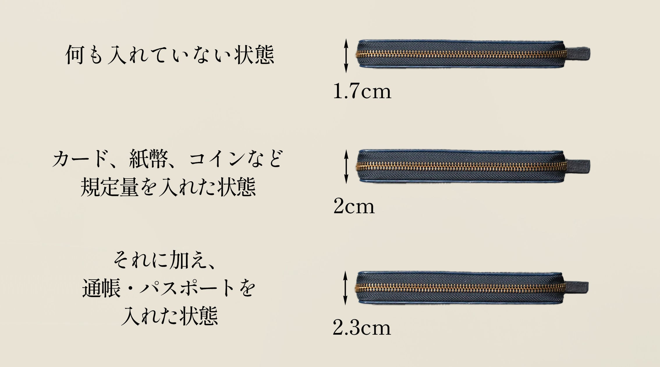 A. お財布に入れているカード等の容量と、挟むものの大きさによっても可能な厚みが変わってくるため、一概には言えないのですが、カード等を規定通りに入れた場合に形を崩さずにお使いいただけるのは約1cm程度です。