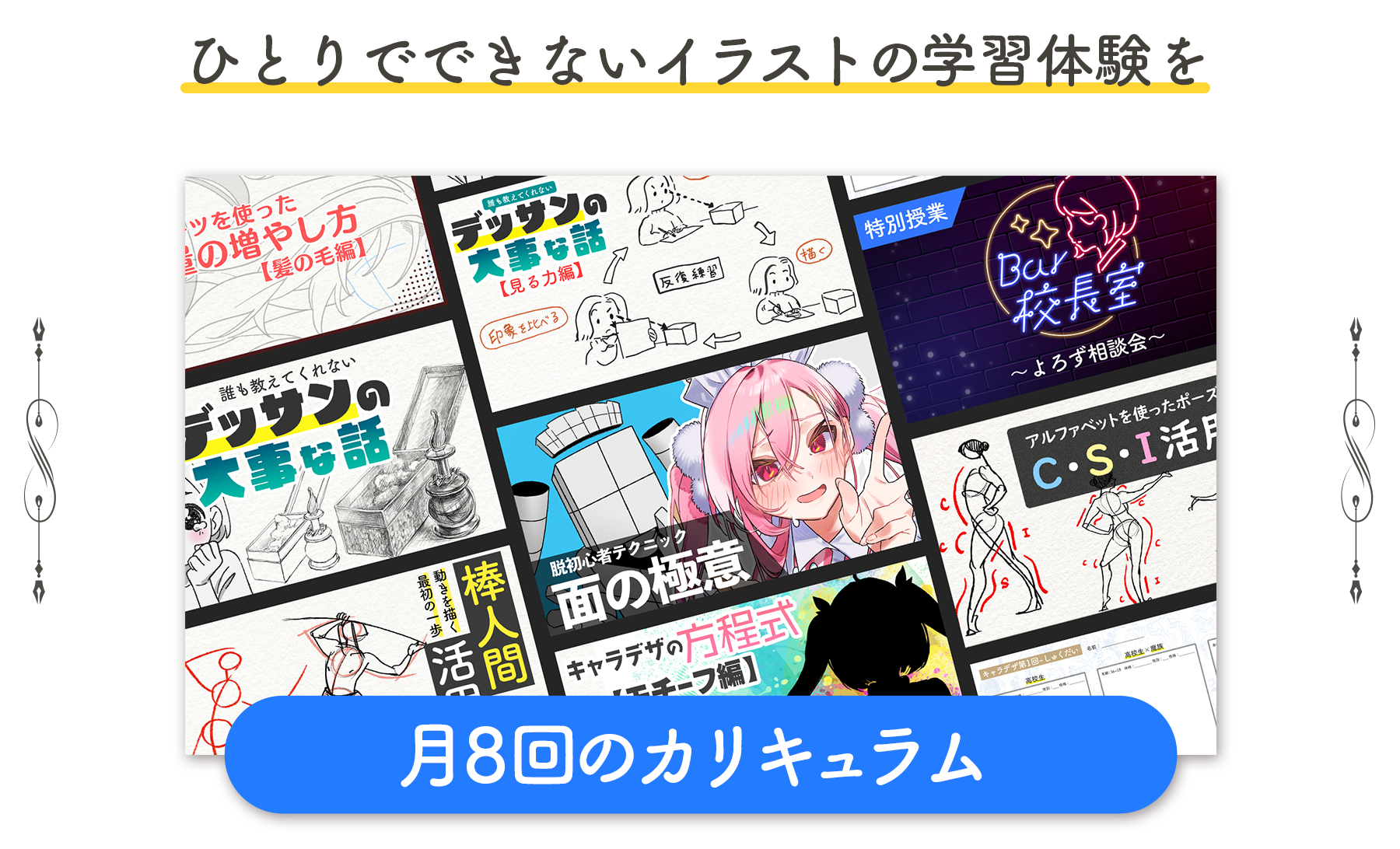 ◆基本カリキュラムとしてイラスト、キャラデザ、デッサン、ジェスチャードローイングの4科目で月8回の授業を開講。