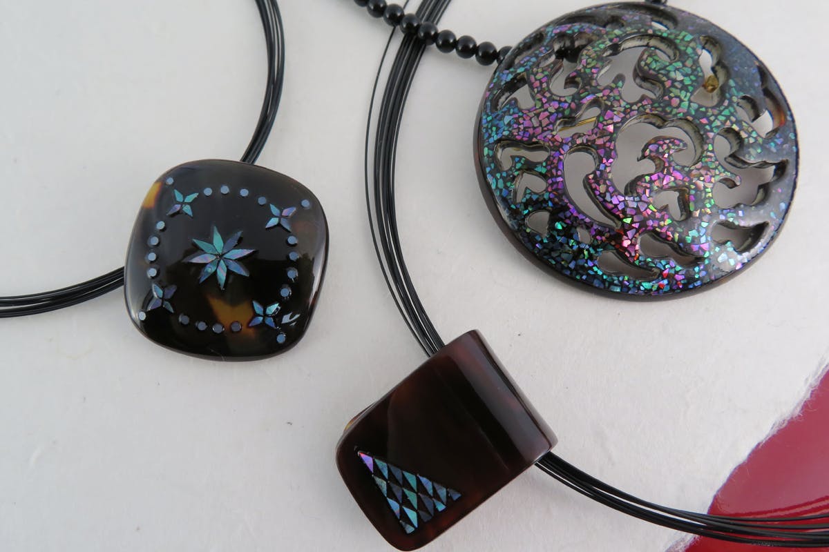 貝の螺鈿工とべっ甲はもちろんですが、天然素材の相性はとても良いのです。螺鈿の伝統技法が今もなお若い工芸家の手の中で生まれていく。それは天然素材のアクセサリーをつくってきた自分にとってやりがいのある仕事です。