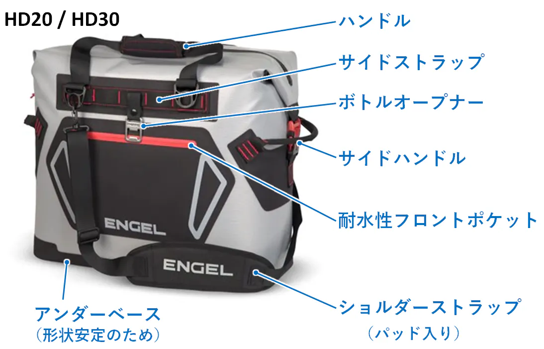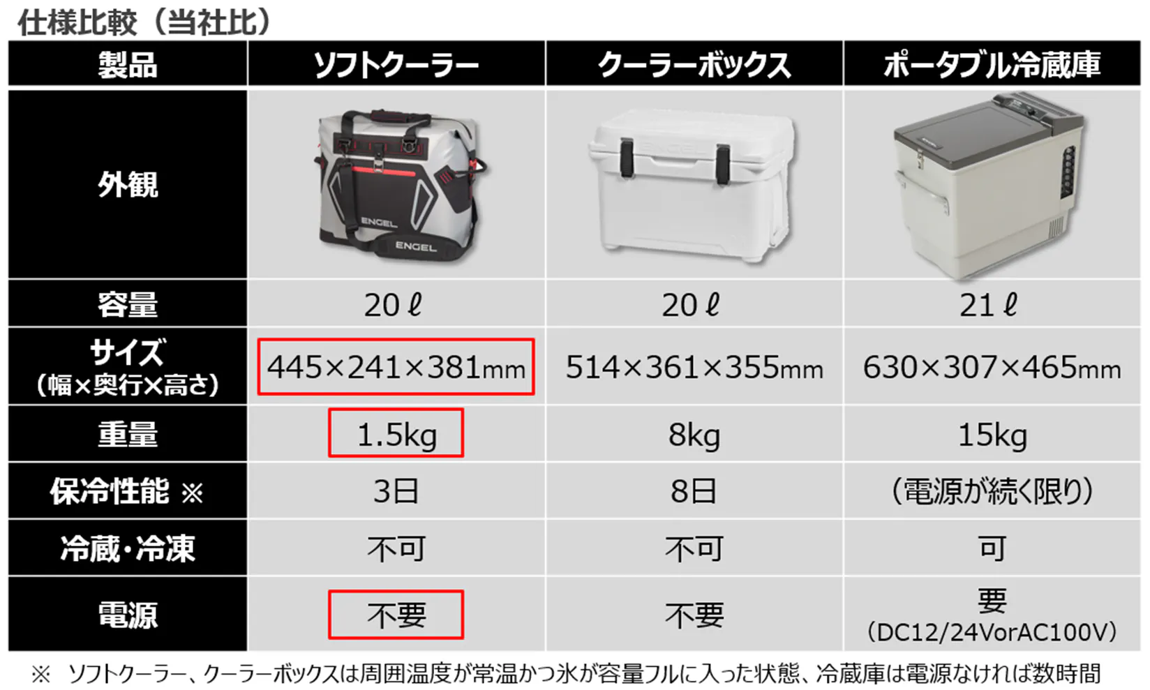 当社のものは特に保冷能力と耐久性が高く、キャンプなどのレジャーや仕事でも活躍します。クーラーボックスほどの保冷力はありませんが、その分とても軽量で持ち運びにとても便利です。