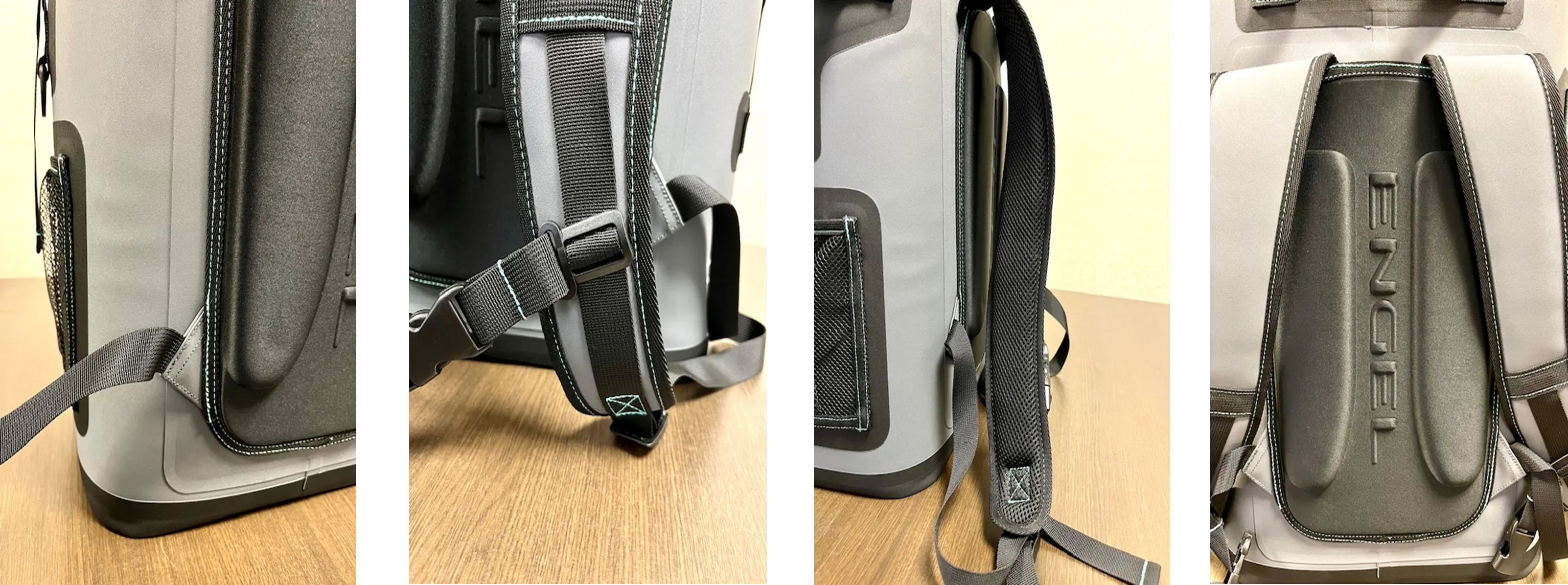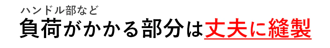 クーラーバッグなので飲料など重いものが入ることが想定されます。運搬時に負荷がかかるハンドルやショルダーストラップ、ショルダーハーネスなどと本体とを結合している部分は、ご覧のように丈夫に縫製してあります。