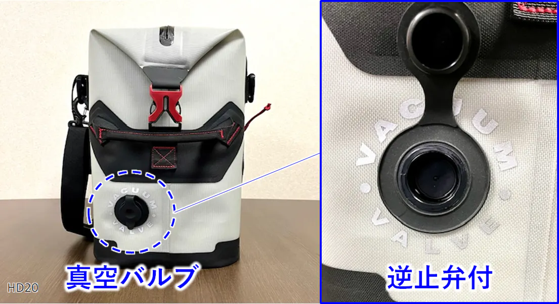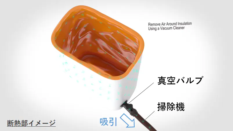 真空バルブ部から掃除機で空気を抜き取ってご使用いただくと断熱部の真空化により断熱性がさらにアップします。もちろん空気を抜き取らずそのままでもご使用いただけます。またバルブ部は逆止弁付きなので焦って作業しなくてもOKです。