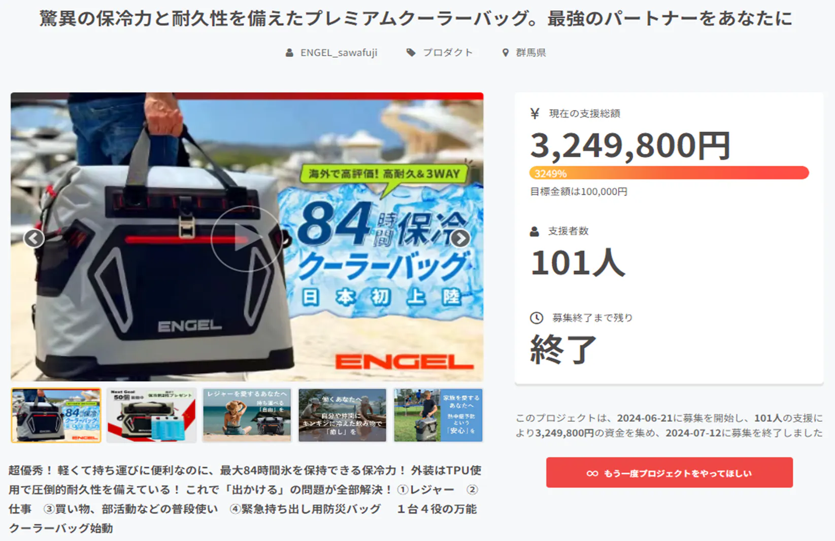 2024/07/16 17:387/12(金)をもちまして、プレミアムソフトクーラーバッグのプロジェクト公開が終了いたしました。支援総額 3,249,800円支援者数 101人支援数量 116件ご支援と拡散のご協力ありがとうございました!現在製品の出荷準備を進めています。順次発送していきますので、到着まで今しばらくお待ちください。もうじき梅雨が明けます。ソフトクーラーバッグの活躍が目に浮かびます!引き続きどうぞよろしくお願いいたします。 もっと見る