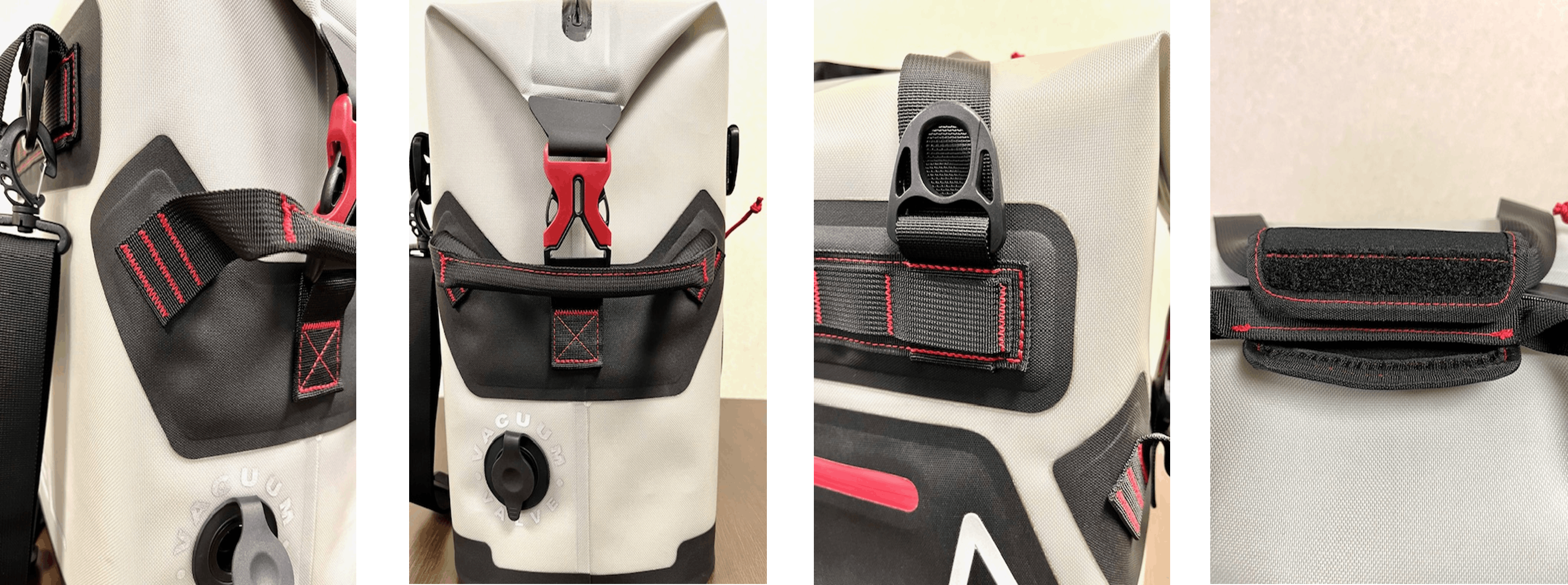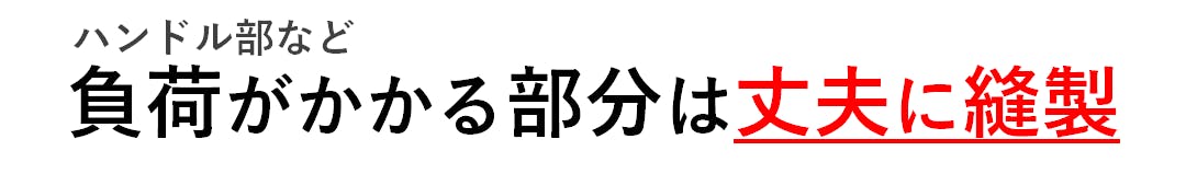 クーラーバッグなので飲料など重いものが入ることが想定されます。運搬時に負荷がかかるハンドルやショルダーストラップ、ショルダーハーネスなどと本体とを結合している部分は、ご覧のように丈夫に縫製してあります。