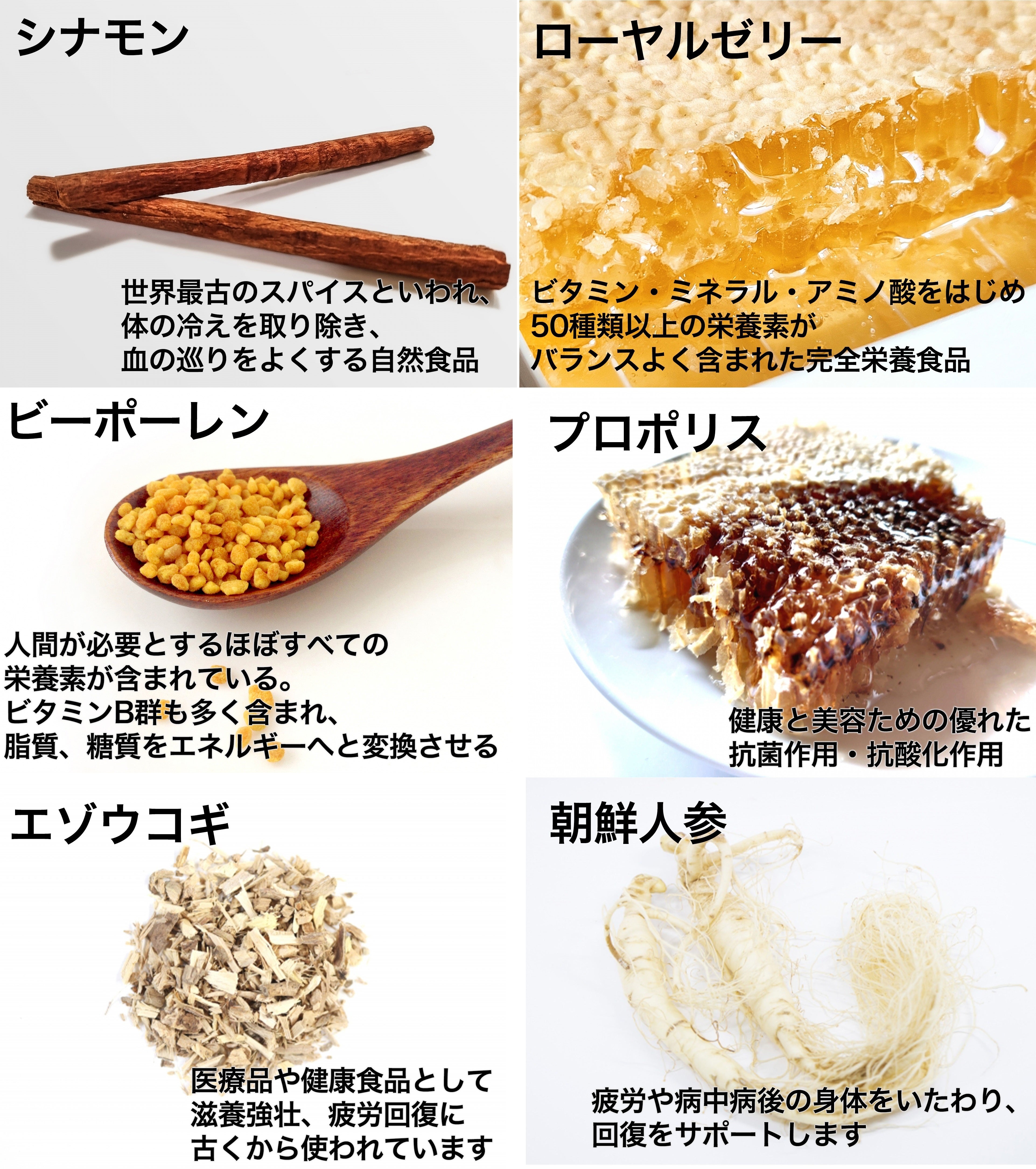 蜂蜜本来の味、香り、栄養、健康効果、成分が生きたまま残る生ハチミツに、以下の成分を絶妙な味わいで配合しています。