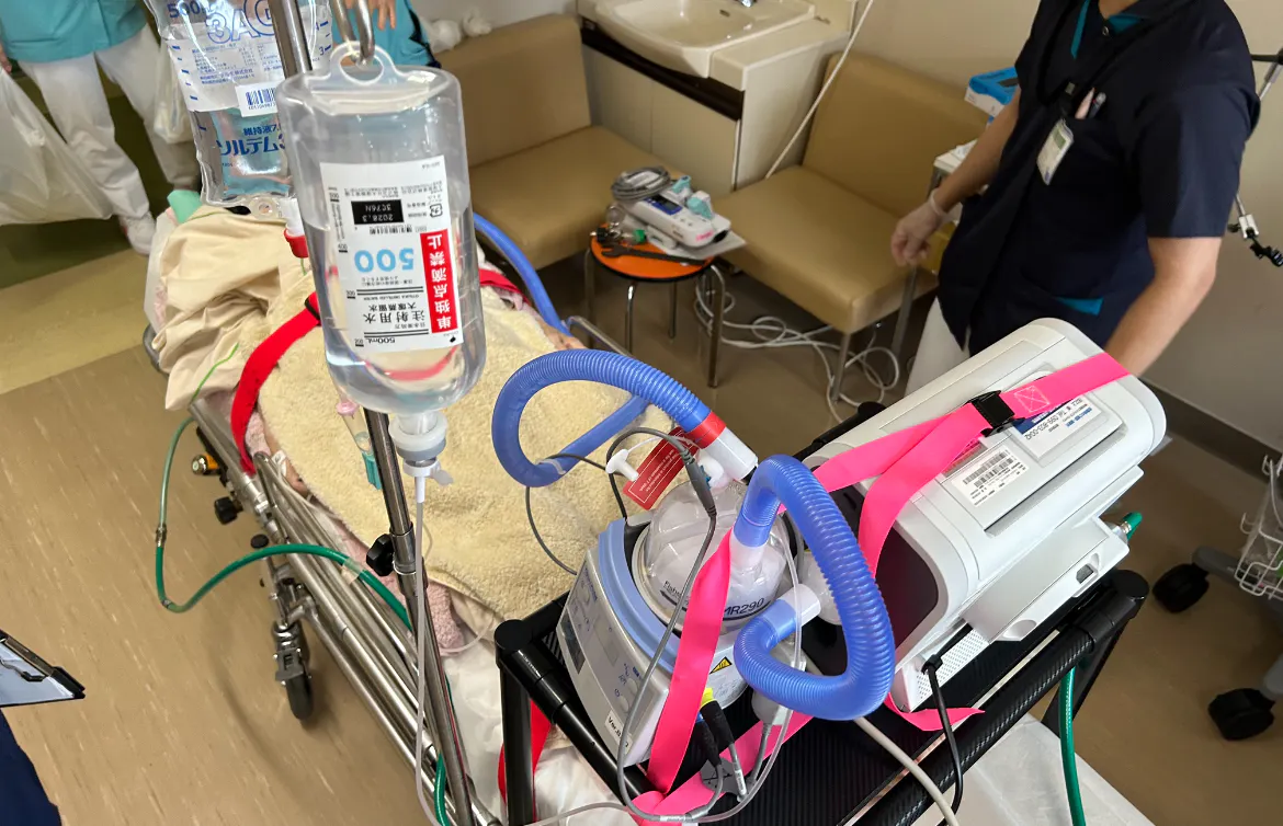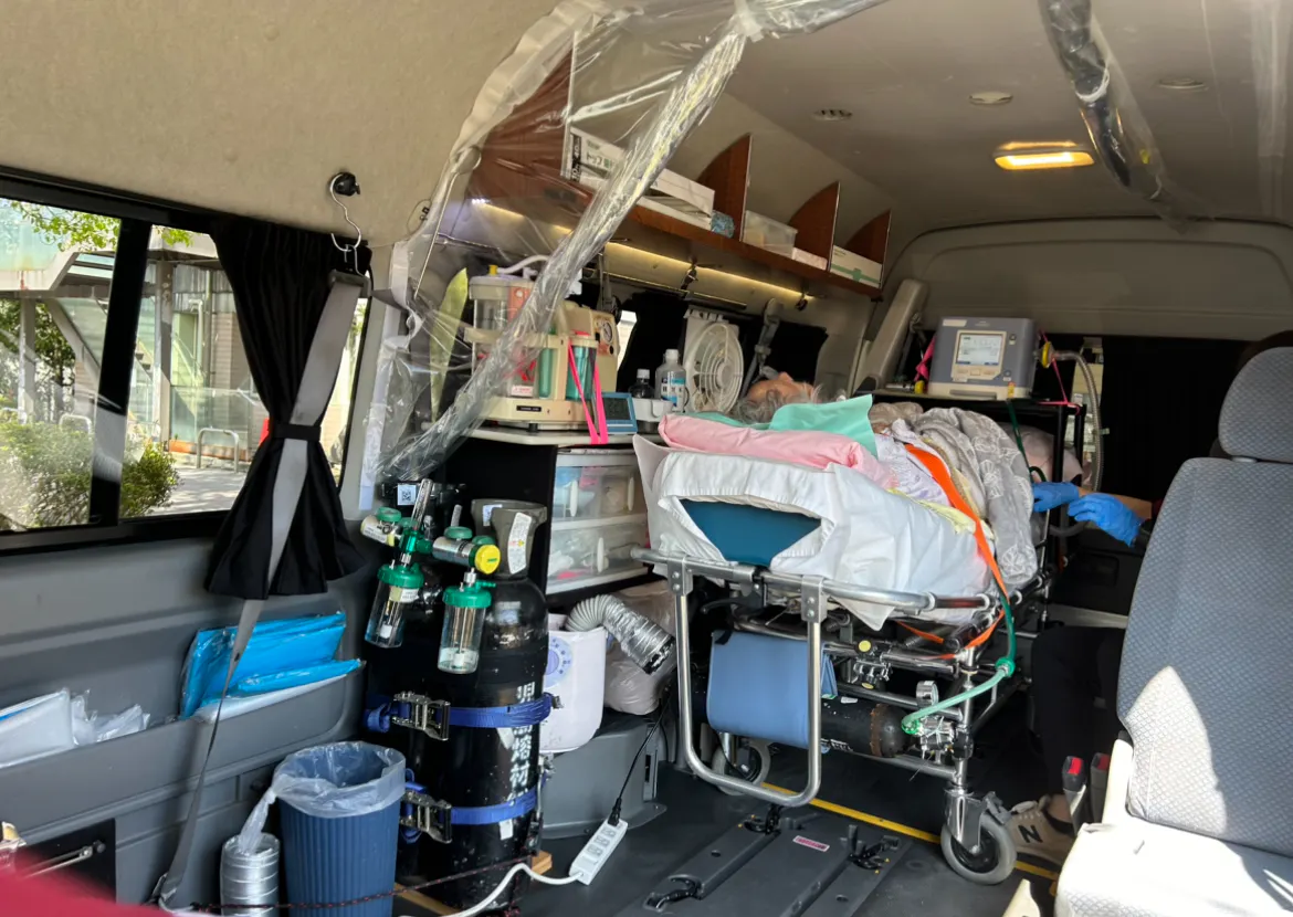 その際は、医療機器を病院から持ち込み、弊社の車両に搭載し、時には病院医師、看護師、介護士のチームで対応します。
