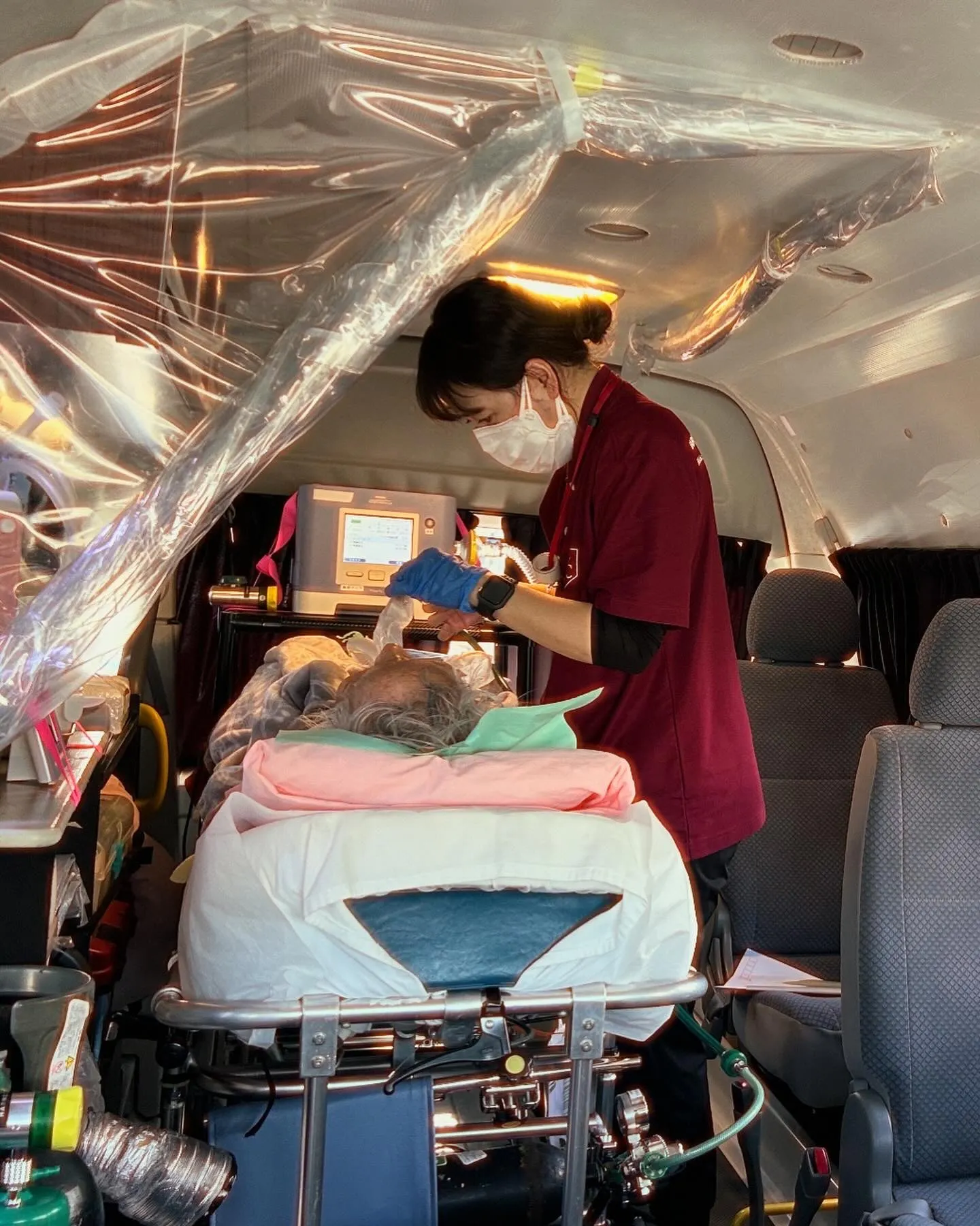たとえば、点滴ポンプが数台、酸素ボンベ+人工呼吸器+加湿器+バルーン(尿のパック)などを患者様と一緒にストレッチャーに装備して100km以上先の地方の病院へ・・・