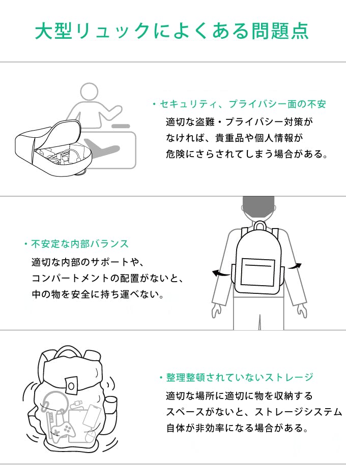 Clickpack Travlo は、大型リュックによくある問題点を解決し、より荷物を入れやすい設計にアップグレードしています。バッグの中は三層構造で、パソコンや着替えなど仕事と私物を仕分けでき、プライバシー対策もできます。このデザインによって荷物が整理整頓でき、簡単に出し入れしやすくなりました。