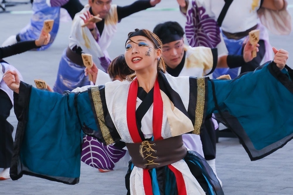 踊り子だけでなく、後ろで力強く演舞に彩りを加える旗士にもご注目ください。