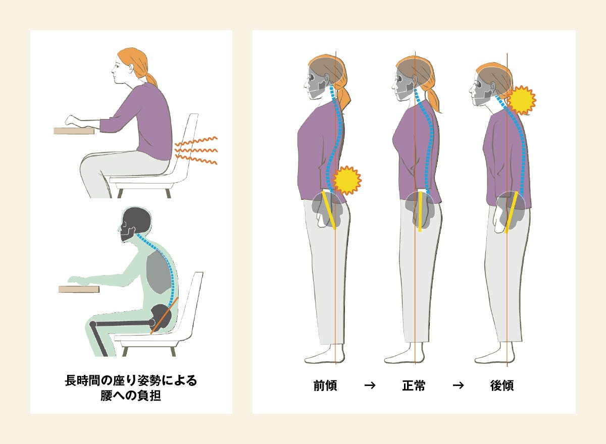 姿勢崩れの多くは長時間同じ姿勢でいることで、強制的な骨盤の後傾(後ろに傾くこと)によって起こります。さらに体のバランスをとるために顔の位置が前へとスライドしてしまいます。頭は体重の10分の1ほどの重さがあるため、顔の位置が少し前へと移動するだけで、首や肩にかかる負担が増大し、肩のコリや首のコリのリスクが増します。