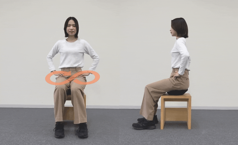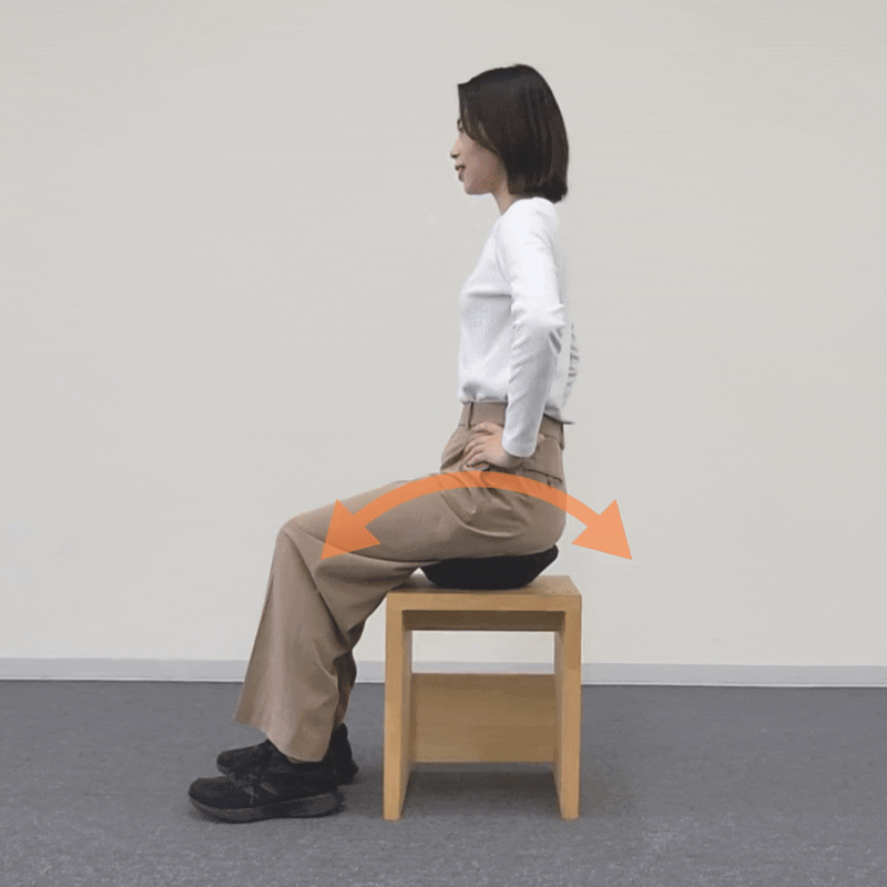 骨盤の前後傾を意識できるので腹筋に力を入れやすくなり、立ち上がりやすくなります。さらに、負担の少ない立ち姿勢がとりやすくなります。