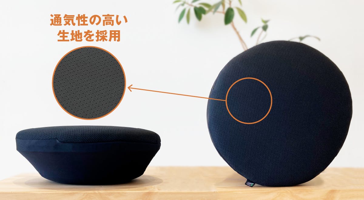 本体は一般的な椅子やソファ等にも使われているクッション性と耐久性のよいウレタンクッション材を使用。カバーは通気性とグリップ性のある生地で構成。ゴム素材を使用していないので、ゴム臭がありません。