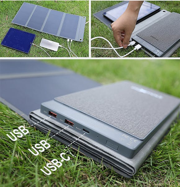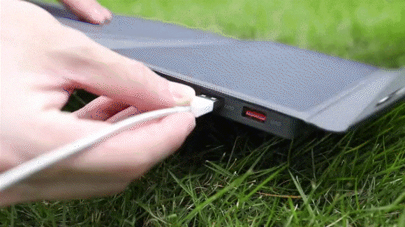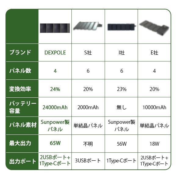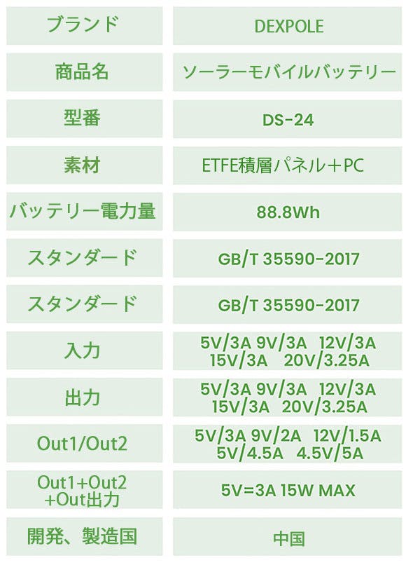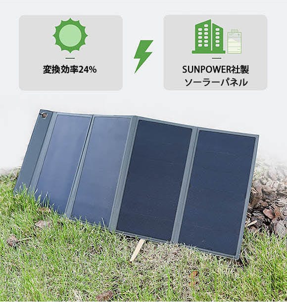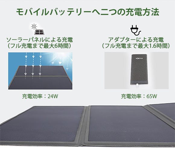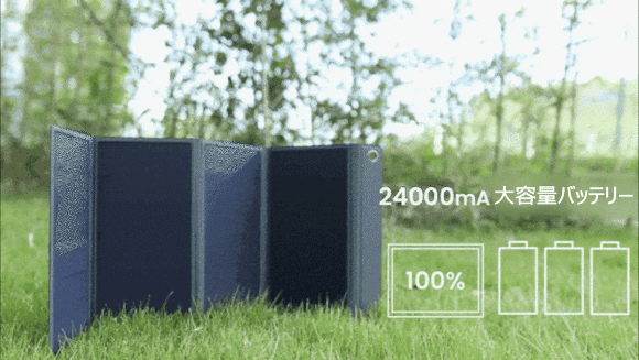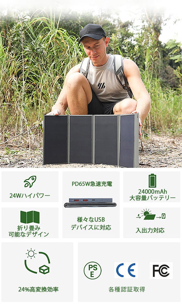 24000mAh大容量バッテリーを搭載。ソーラーパネル4面でフル充電することが可能です。USB1/USB2の最大出力は15Wで、Type-Cの最大出力は65Wです。