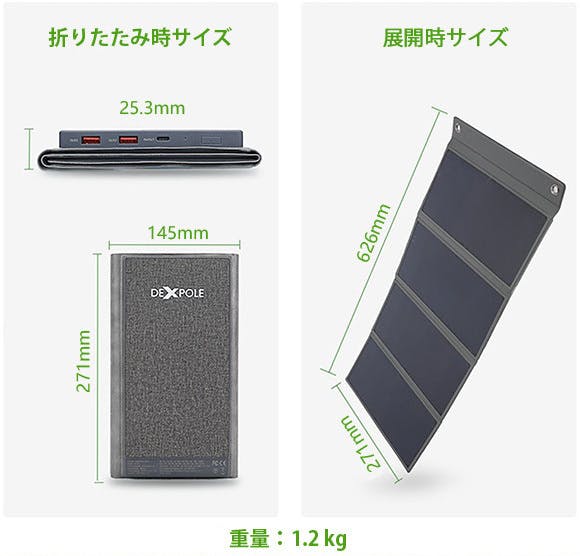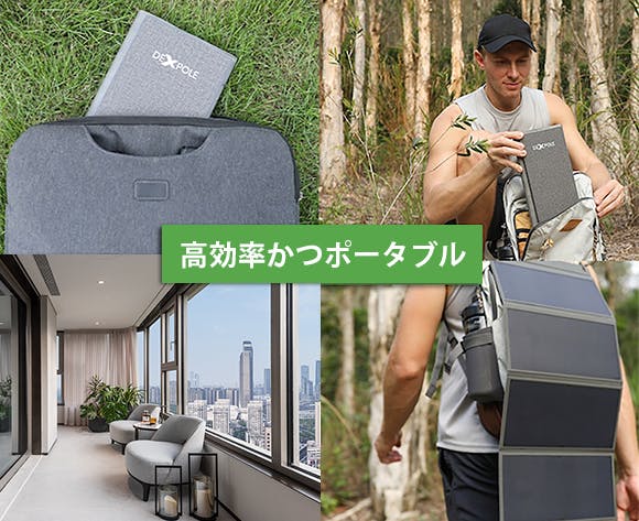 「DEXPOLE」は革新的なソーラーモバイルバッテリーです。24,000mAh大容量バッテリーを搭載し、最大65W出力でPCまで充電できるため、ビジネスシーンからアウトドアまであらゆる場所で活躍してくれます。