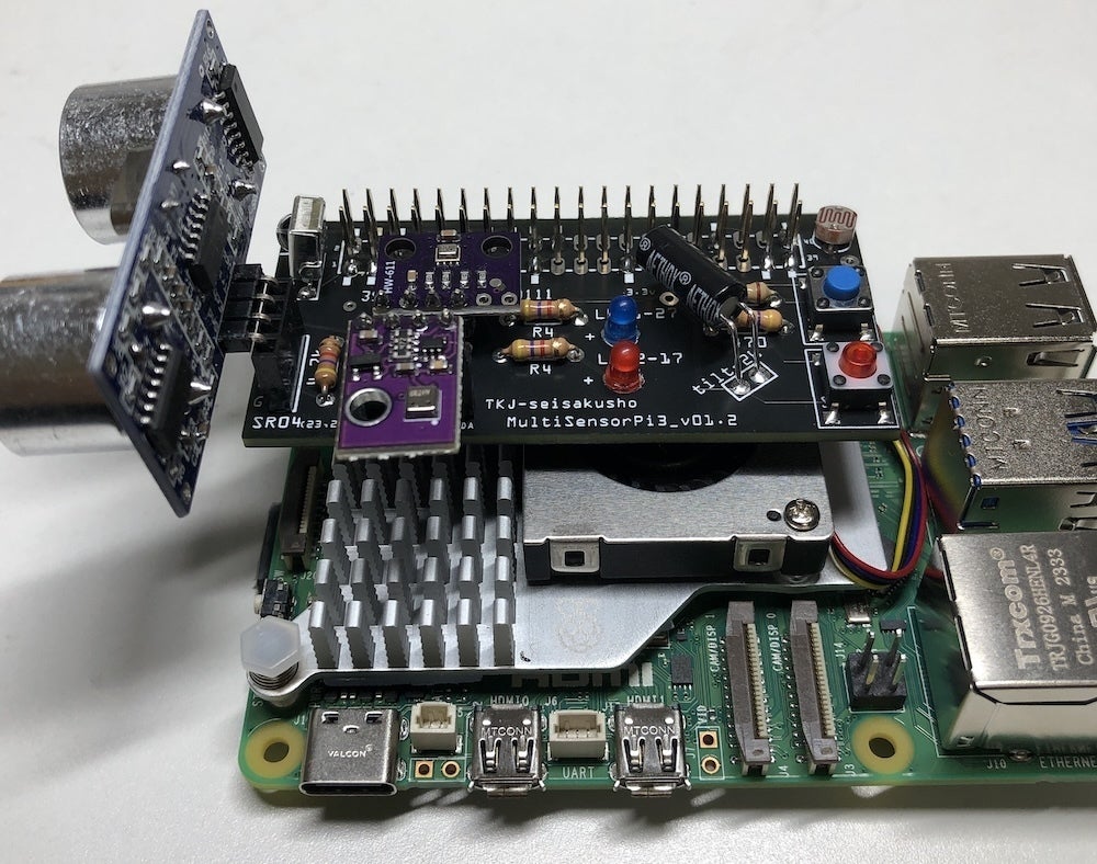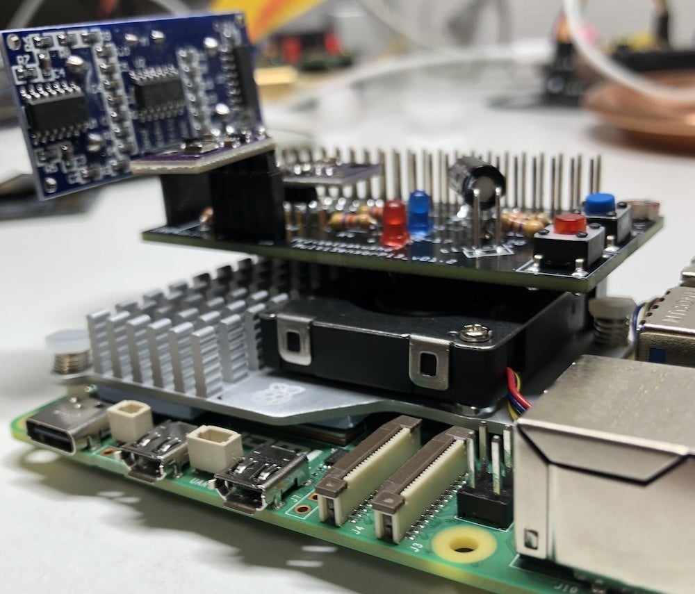 以前も同様の製品を開発しましたが、Pi5 bookwormではRPi.GPIO、wiringPI、pigpioが動作しなくなり使えなくなりました。そこで、今回プログラムを全面的に作り直すとともに、Pi5の発熱対策としての純正アクティブクーラー装着時にも干渉しないように高さのある連結ソケットを使用しています。