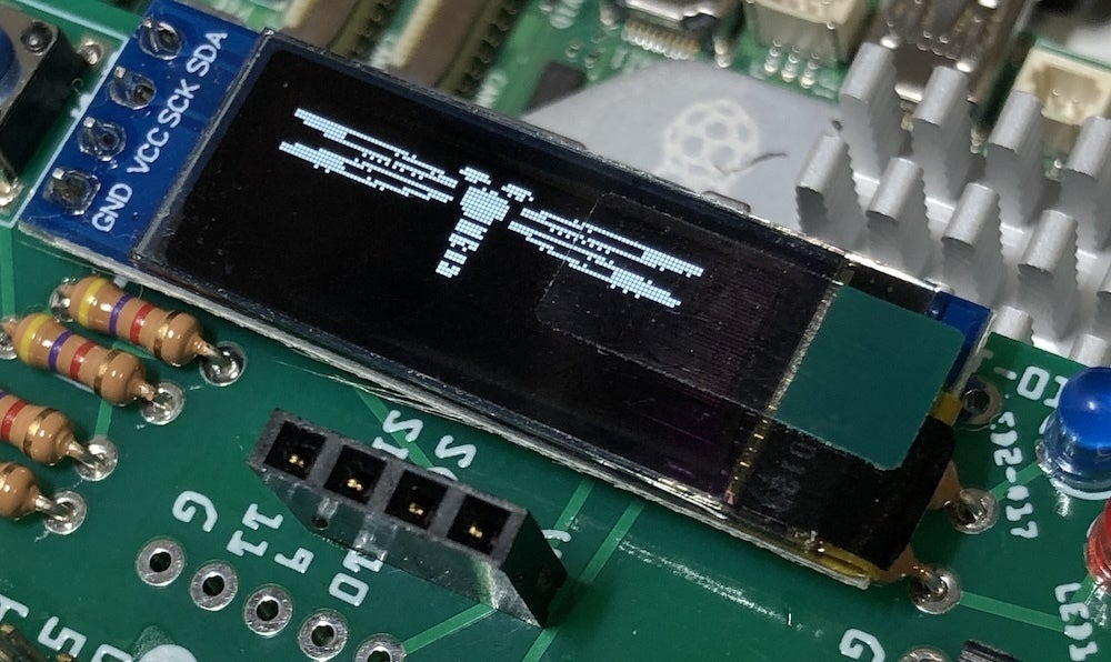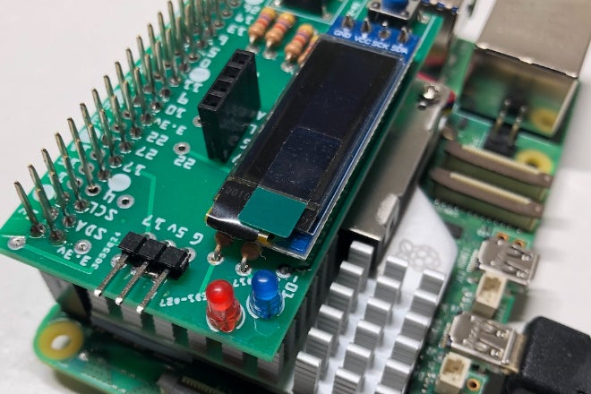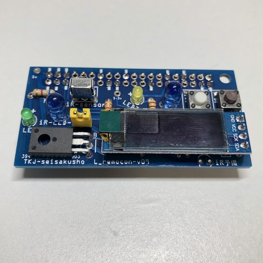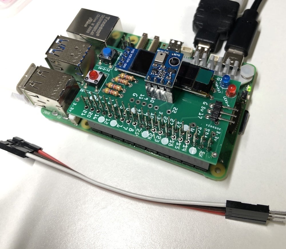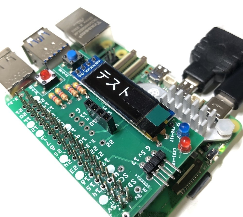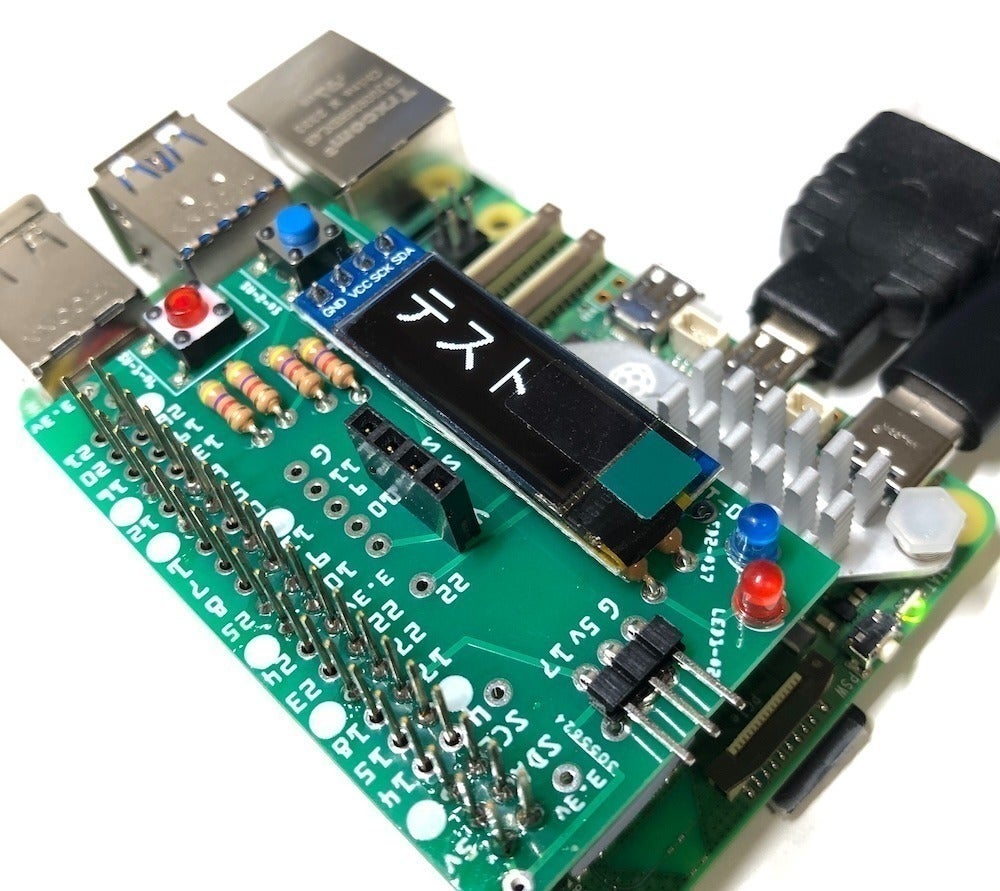 OLEDとスイッチ2個、LED2個を実装したテスト用のラズパイ専用基板です。ブレッドボードで何か作ろうとしたときに、最低限のUIが必要ですが、それらもブレッドボード上に作るのは面倒です。
