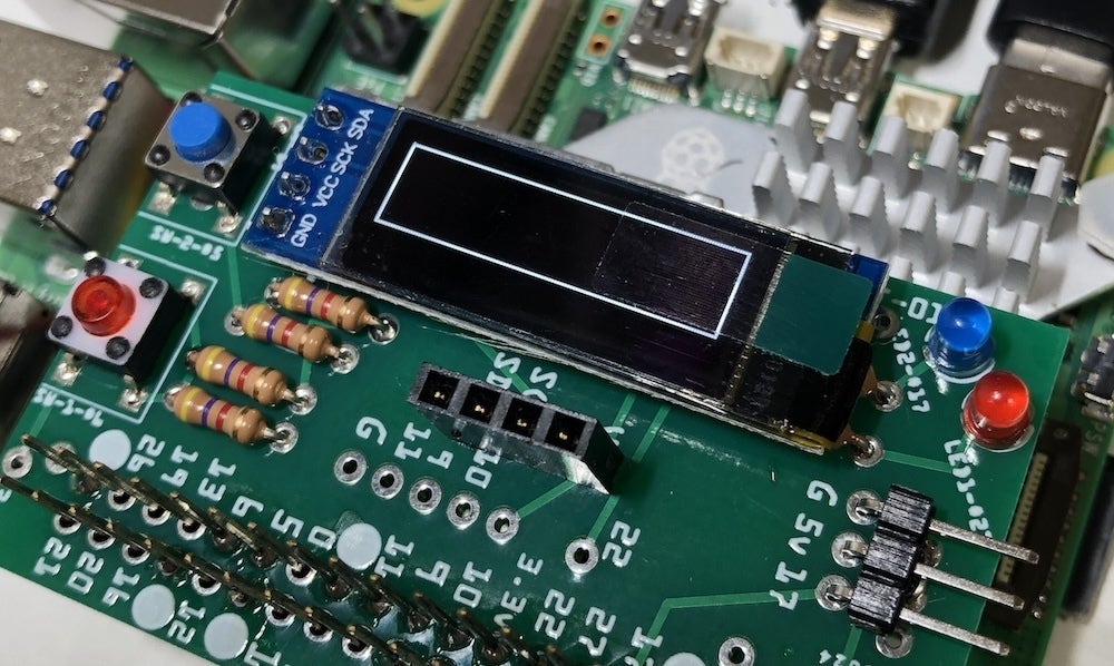 OLEDとスイッチ2個、LED2個を実装したテスト用のラズパイ専用基板です。ブレッドボードで何か作ろうとしたときに、最低限のUIが必要ですが、それらもブレッドボード上に作るのは面倒です。
