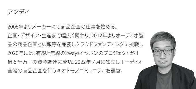 はじめまして、株式会社ベタベタの安藤(アンディ)と申します。私たちは「#オトモノ」というみんなで一緒に音にこだわったものづくりに挑戦していくコミュニティをオーディオの専門家の野村ケンジさんと一緒に運営しております。今回は、コミュニティの活動の中で生まれたインイヤーモニター型の平面駆動ドライバーをクラウドファンディングすることになりましたのでみなさま応援を何卒よろしくお願いいたします。