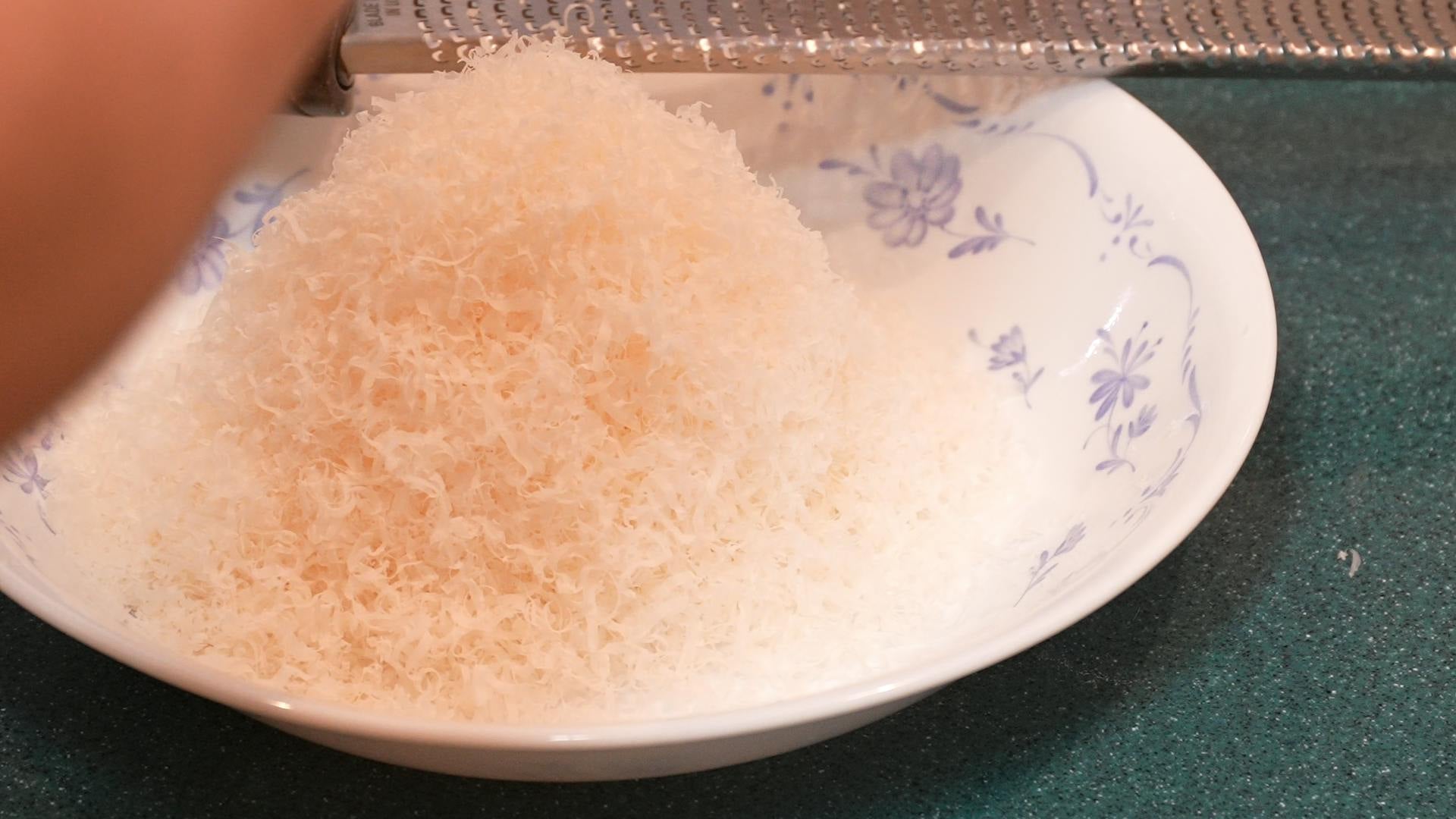 コクの決め手、パルミジャーノ・レッジャーノはたっぷり削ります。粉チーズでもいいですが、輸入食品店でブロックを買ってくるのがオススメです。チーズの匂いが強くなるので、量はお好みです。