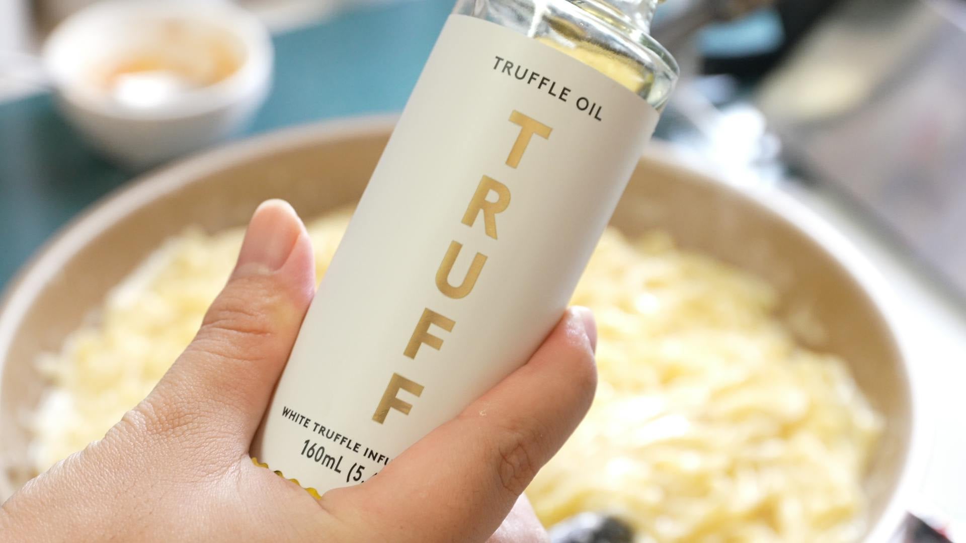 トリュフの香りを全体に回すためにこのタイミングで火を止めて、トリュフオイルをかけます。今回は大さじ1程度使いました。香りの強さに直結するので、ここはお好みで調節します。