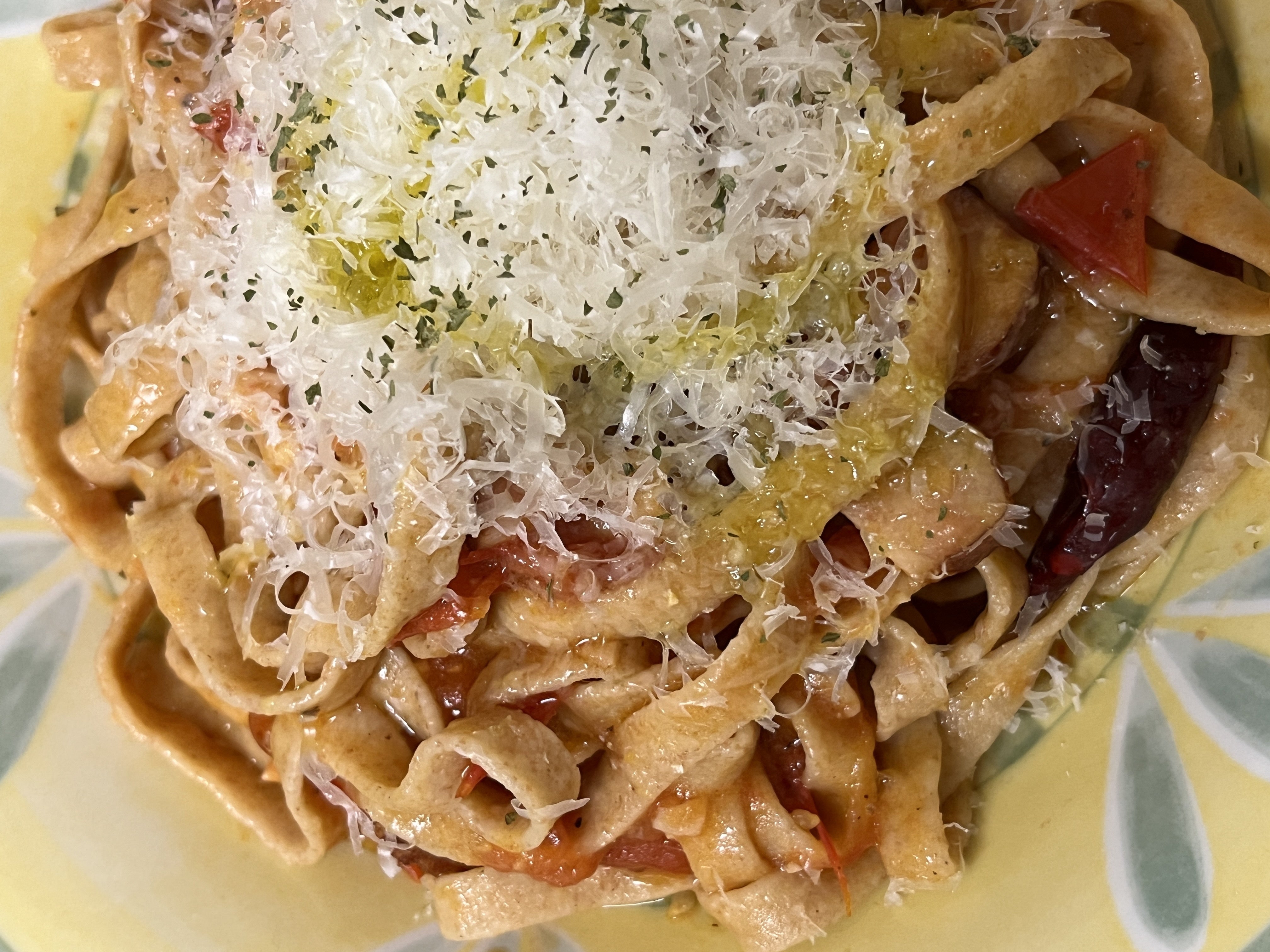 支援者の皆様、並びにご興味を持って頂いている皆様全自動生パスタメーカー「EF-PM02」は残り1日となりました!現在もご支援を伸ばし続けています!皆様のご支援、ありがとうございます!ところで、「全粒粉は使えますか?」というお問合せをいくつか頂いているのですが・・・恥ずかしながら、起案者は全粒粉や玄米といった健康志向の料理が少し苦手なのです。食べられはするのですが、玄米と白米を並べられたら白米を選んでしまう。どうしても「健康にはいいが味は落ちる」という認識を持っているのです。実際、全粒粉でパスタを提供しているお店はほぼないので、それなりに説得力のある主張ではないでしょうか。とはいえ、全粒粉パスタ自体、食べた回数は多くありませんので、テストしてみようと思います。 【テスト環境】製麺機:EF-PM02全粒粉強力粉:160g(付属カップすりきり一杯)デュラム・セモリナ粉:160g(付属カップすりきり一杯)卵液:120ml(卵2個、塩、オリーブオイル)さっそくデュラムセモリナを先に入れ、全粒粉を投入。全粒粉は普通の強力粉よりもややダボついている印象です。自動製麺でいつもと同じように30秒ほど混ぜ、卵液を投入します。※結合が不安だったので卵は2個今のところ順調です。特にダマになることもなくしっかり混ざってくれています。この間にソースを作ります。今回は燻製ベーコンのアラビアータにしました。白い小麦粉なら最高に合うソースではありますが、全粒粉パスタは果たしてどうなるか・・・・そうこうしているうちに全粒粉の平打ち麺が出てきました。無事麺が出てきてホッとしましたが、明らかに問題があります。デュラム・セモリナ粉と全粒粉がちゃんと混ざっていないのです。混ざり方に明らかなムラがあり、乾燥してささくれ立っています。一方で、しばらく経つとよく混ざった麺が出てきました。しっとりとしていて美味しそうです。おそらく、粉の比重が違うためにこういうことが起こったのかと思います。全粒粉→デュラムセモリナ粉→パスタメーカーの「こねる」機能を使って入念に混ぜ合わせる必要がありそうです。少し普通の強力粉よりも手間がかかりそうですね。麺が出来上がりました。少しムラはありますが、全粒粉らしい綺麗なブラウンです。最後にお湯で茹でて、アラビアータソースと和えれば完成です!パルミジャーノは起案者の好みです。ややザラっとしていて、素朴な香りと旨みが口に広がり、燻香の強いベーコンとニンニクの風味をしっかりと受け止めてくれます。これは美味しい。少なくともこれまで私が経験してきたような健康食の代用品という印象はありません。これならぜひまた食べたいですね。一方で一部のソースとは喧嘩しそうだなという印象も受けました。パンチの効いた味なら大丈夫かと思いますが、スープパスタなど繊細さが出る料理ですと、全粒粉の香りを加味した作り方をする必要があると思います。今回の材料です。製麺機:EF-PM02全粒粉強力粉:160g(付属カップすりきり一杯)デュラム・セモリナ粉:160g(付属カップすりきり一杯)卵液:120ml(卵2個、塩、オリーブオイル)注意点はこねる際には普通の強力粉よりも入念に混ぜる必要があることですね。家庭では不要かと思いますが、お店で出すレベルを求めるなら事前に粉を振って丁寧に混ぜ合わせておくのも手かもしれません。さて、終了まで残り1日、最後まで駆け抜けていきますので、応援よろしくお願いします!起案者