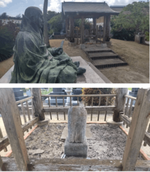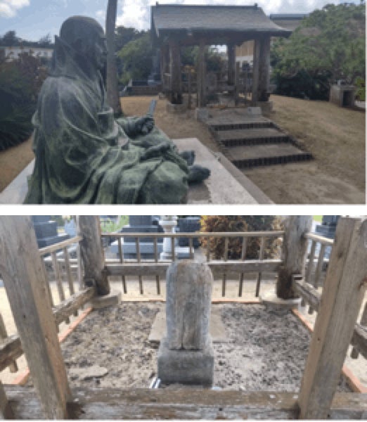 俊寛像の奥に、墓石が立っています。墓地について、地元の人々は長年「ボーズンメ(坊主前)」と呼び、俊寛の墓とされていました。