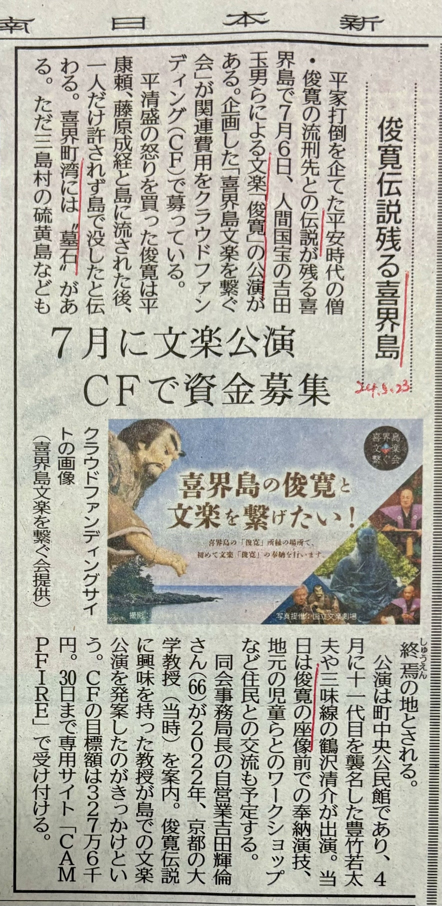 本日南日本新聞さんに喜界島の文楽とクラウドファンディングが掲載されました!