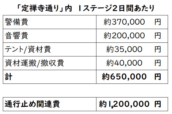 ・ストリートピアノ設置…約80万円(ピアノ搬入・搬出費約40万円、警備費約10万円、備品・装飾費30万円)