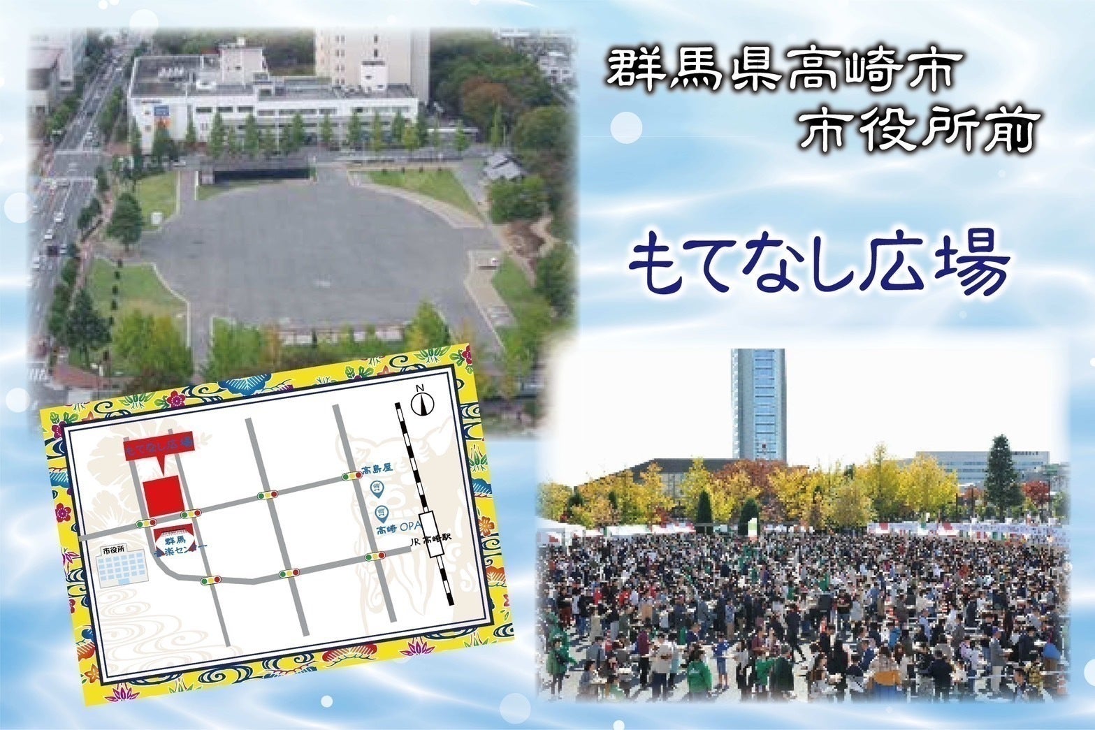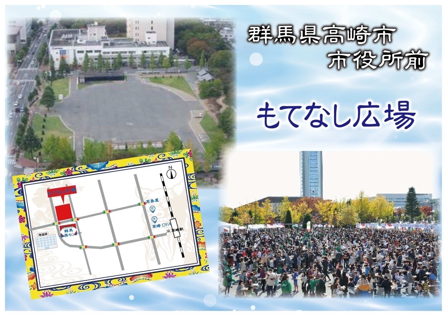 群馬県の玄関口である高崎市は東京都心からも新幹線で約50分となっており、県外の来場者様も足を運びやすくなっております。開催場所になる ≪もてなし広場≫ はJR高崎駅から徒歩約10分。緑に囲まれた開放的な環境で沖縄の空気感を体感していただきたいです。