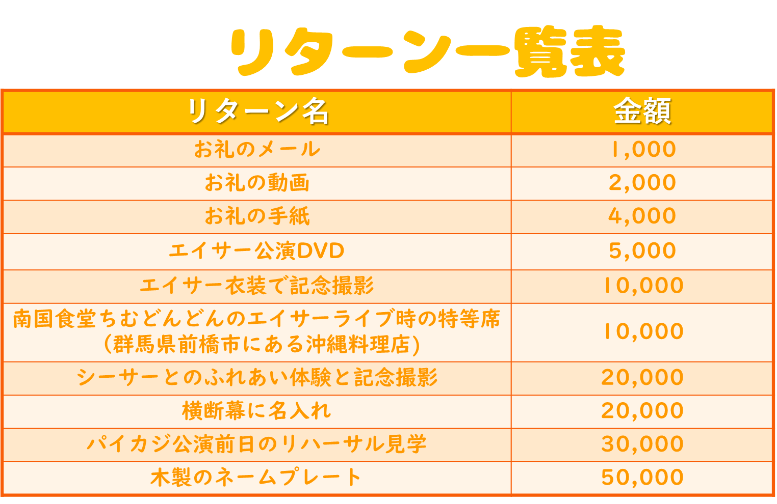 リターンは、支援してくださる方により選択しやすくなるように設定させていただきました。