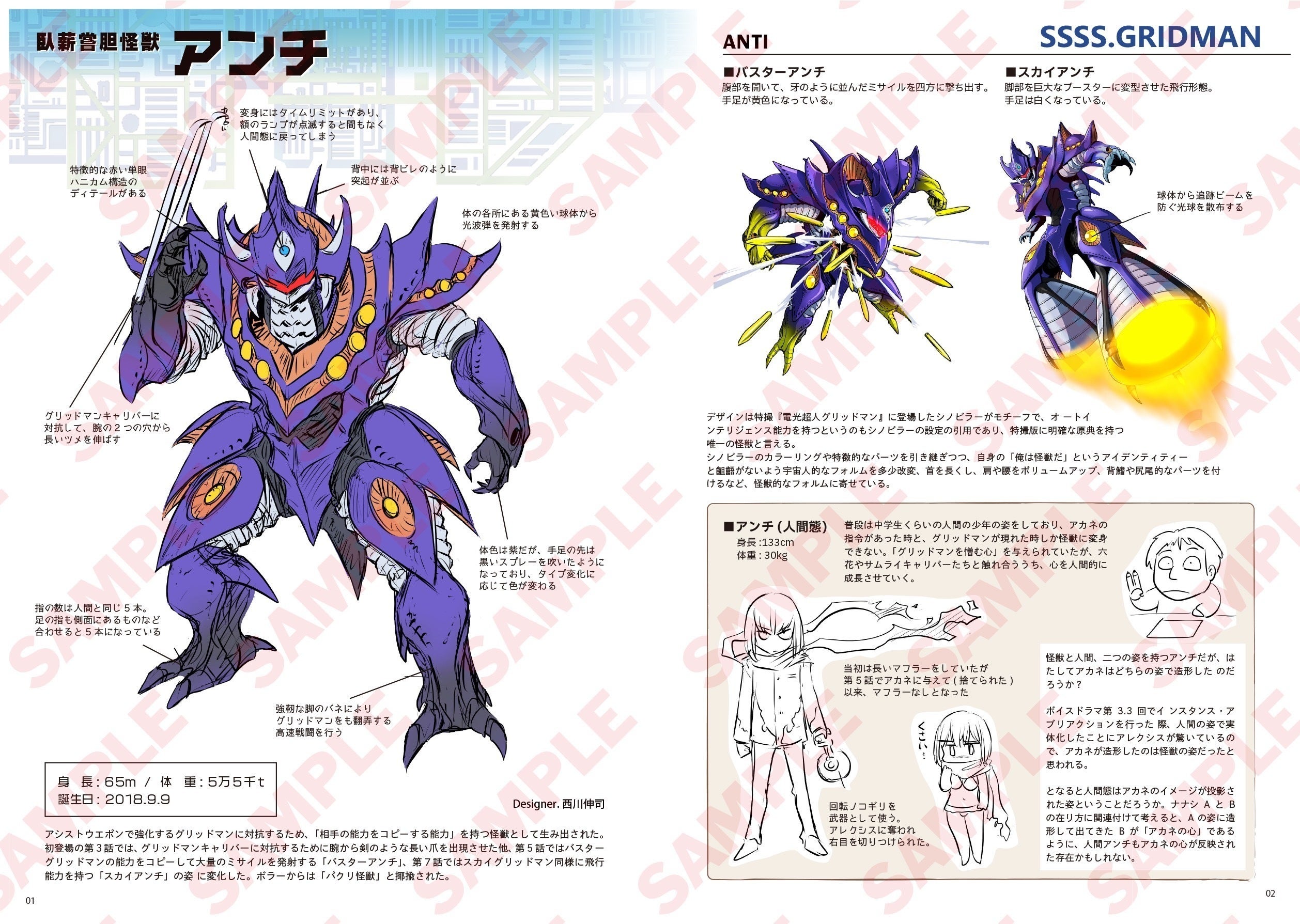 今回の「西川伸司の怪獣解説図鑑 『GRIDMAN UNIVERSE』」は、大きく分けて2つのブロックで構成されます。先ずはデザイン画パートです。『SSSS.GRIDMAN』『SSSS.DYNAZENON』『グリッドマン ユニバース』と3作品を通じて西川伸司氏が描いてきた“怪獣デザイン”を中心にその独創性溢れるデザイン画を徹底収録。さらに、今回の図鑑出版プロジェクトの目玉でもある図鑑パートです。ココでは描き下ろしのイラストとカット満載で“怪獣たち”を紹介。その全てが描き下ろしや大幅加筆による当図鑑のみの作品ばかりです。氏がデザインした“怪獣”はもちろん、他のデザイナーたちが描き出した“特徴溢れる怪獣の造形美”を余す所なく紹介し尽くします。