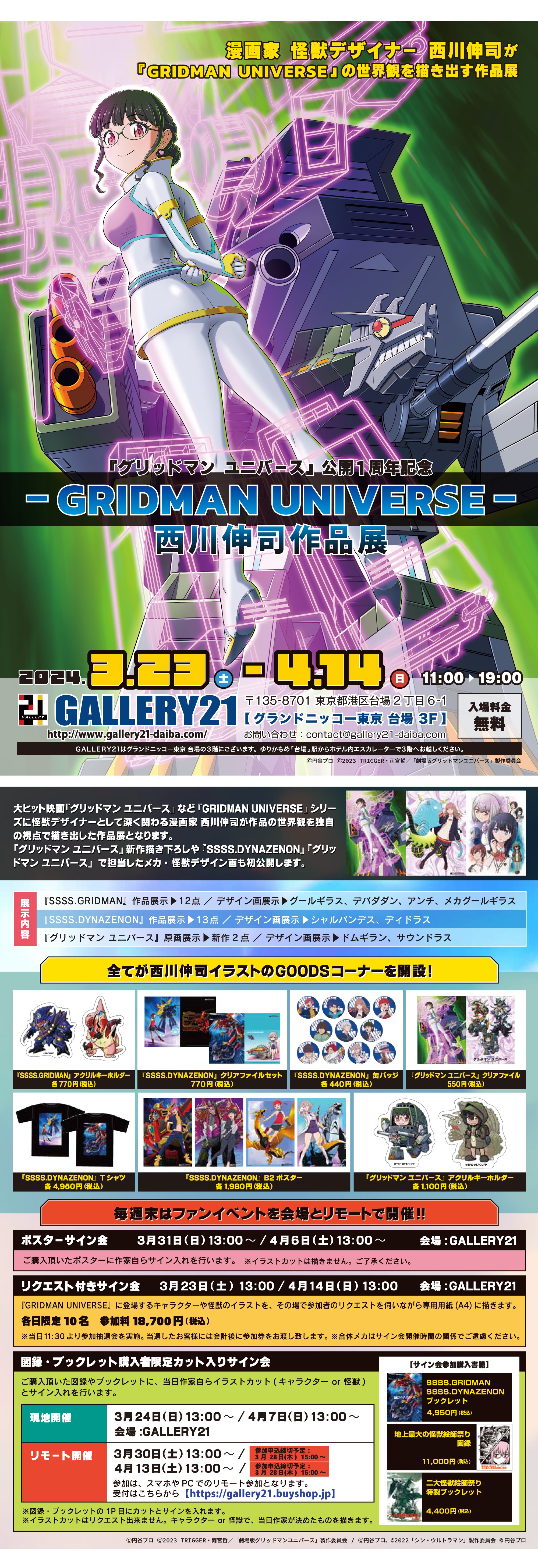 『グリッドマン ユニバース』公開から1年。『SSSS.GRIDMAN』『SSSS.DYNAZENON』『グリッドマン ユニバース』の怪獣デザイナーとして参加した漫画家 西川伸司。『GRIDMAN UNIVERSE』にスタッフとして関わりながらも、その世界観を漫画家としてイラスト展開してきました。4月14日まで開催中の『西川伸司作品展GRIDMAN UNIVERSE』では、華麗にして緻密な筆致による作品全てがご覧頂ける貴重な機会です。ぜひご来場ください。