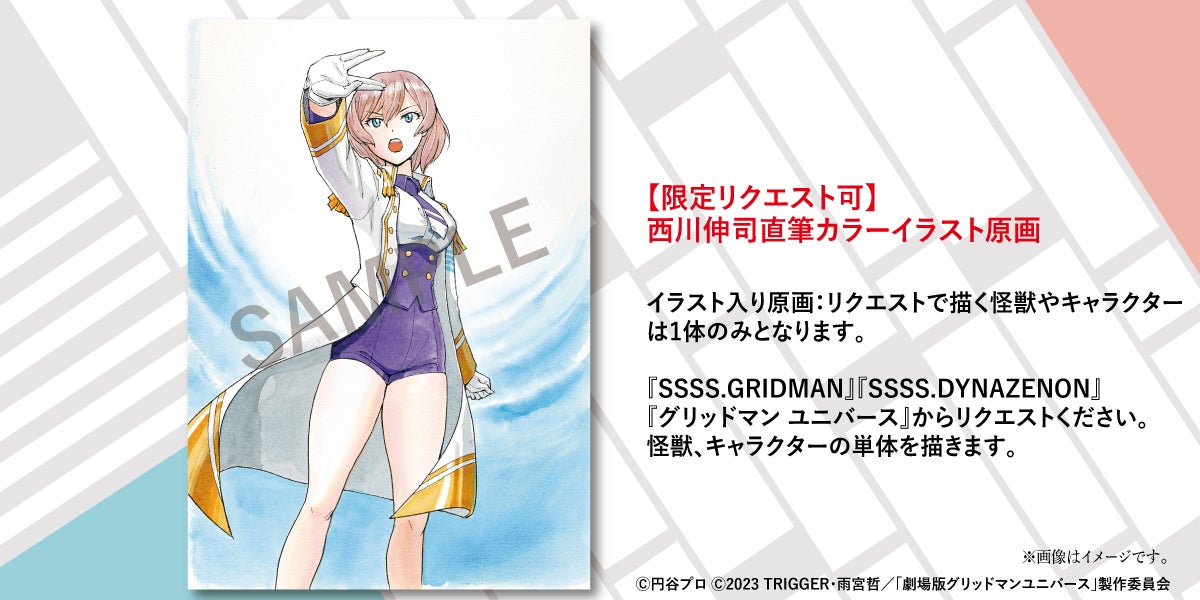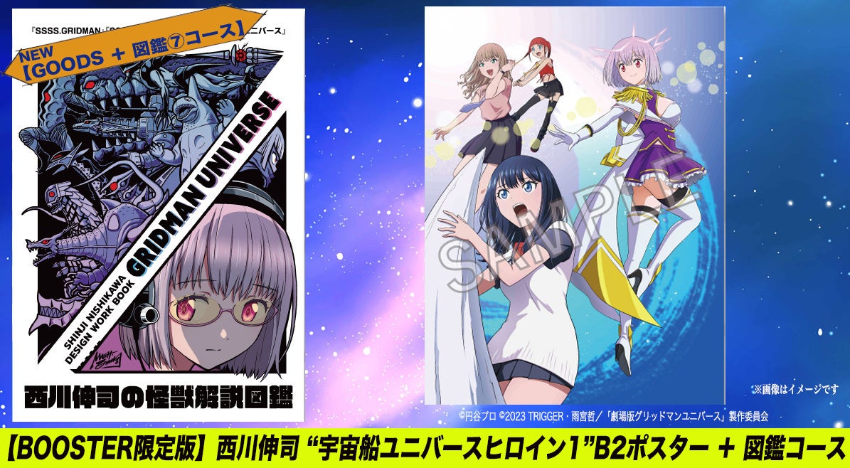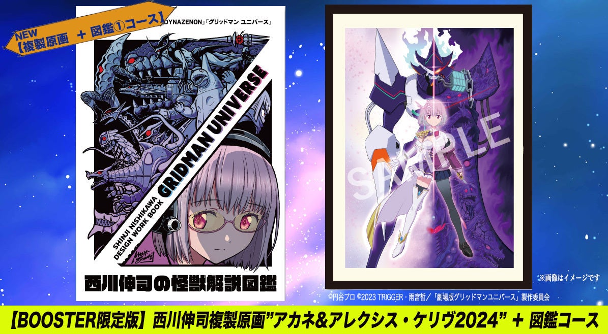 作品展用に西川伸司が描き下ろしたイラストを使用したB2ポスターが登場!作品展描き下ろしイラスト『グリッドマン ユニバース』 “サウンドラス合体!” ポスター』 と『西川伸司の怪獣解説図鑑』のセットコースです。