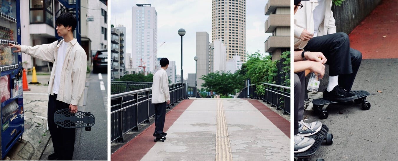 家から駅やコンビニ、カフェなど、歩いていけない距離でもないけど、ちょっと遠い。自転車だと駐輪場に止めるのが手間だと感じる。そんな、日常的な移動を気軽で快適なものにするために移動手段としてスケートボードに着目しました。昨今は、シェアサイクルや電動バイクの普及により、手軽で快適な移動手段が人々の生活により浸透しています。一方でシェアサイクルは乗ることのできるエリアが限られていたり、電動バイクは使うときに駐輪場から運ぶ手間があったり、駐輪スペースが限られていたりと、身近な場所へより手軽に移動できる手段があるのではないかと思いました。