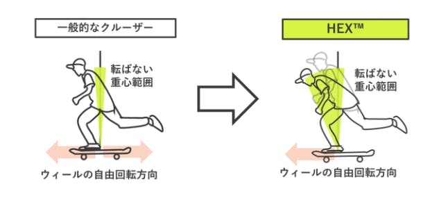 HEX™は、幅広で乗りやすいとされるコンパクトスケートボードの幅と、持ち運びに適した22inchミニクルーザーの前後のウィールの間隔をベンチマークした設計で、”持ち運びやすさと乗りやすさを両立”しました。