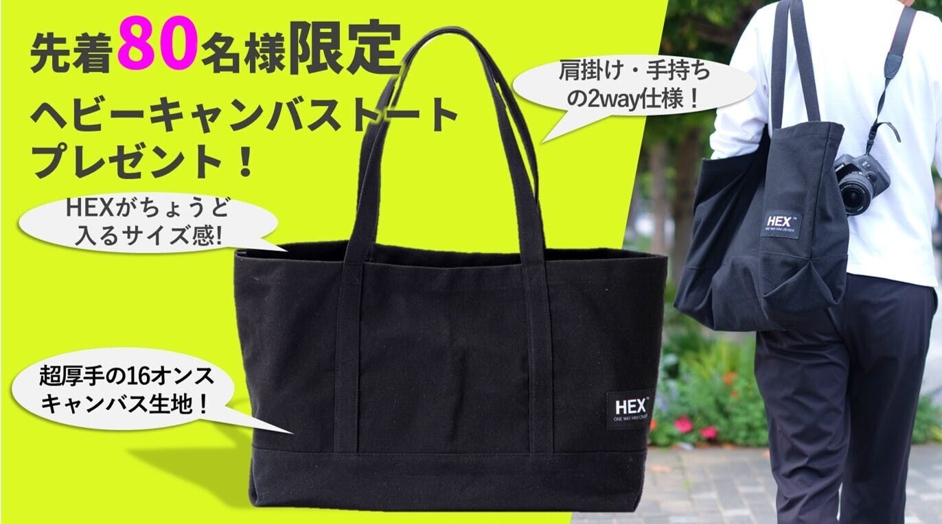 先着80名限定HEX専用トート付きリターンを用意しました。!超厚手の16オンス生地なので汚れてもガシガシ洗えてお手入れが楽です。洗う度に風合いが少しずつ変化するエイジングも魅力です。