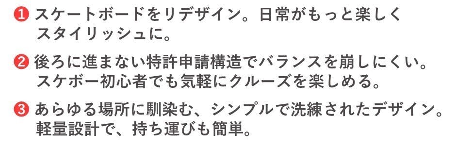 そこで、これらの課題を解決するためスケートボードを1から見直し、持ち運びやすく大人が乗っても違和感のないデザインで、とにかくバランスが取りやすいスケートボードを開発することにしました。企画にあたり、スケートボードでの移動=クルージングを気軽にするための構成要素を以下の様に定義して企画を開始しました。