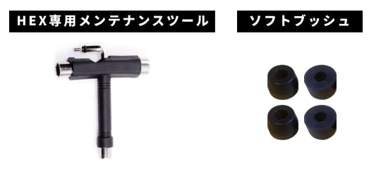 カスタム用のHEX専用メンテナンスツールと乗り心地を変える交換用のソフトブッシュが付属しています。お好みに合わせてカスタマイズできます。