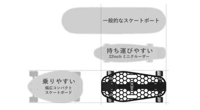 HEX™は、幅広で乗りやすいとされるコンパクトスケートボードの幅と、持ち運びに適した22inchミニクルーザーの前後のウィールの間隔をベンチマークした設計で、”持ち運びやすさと乗りやすさを両立”しました。