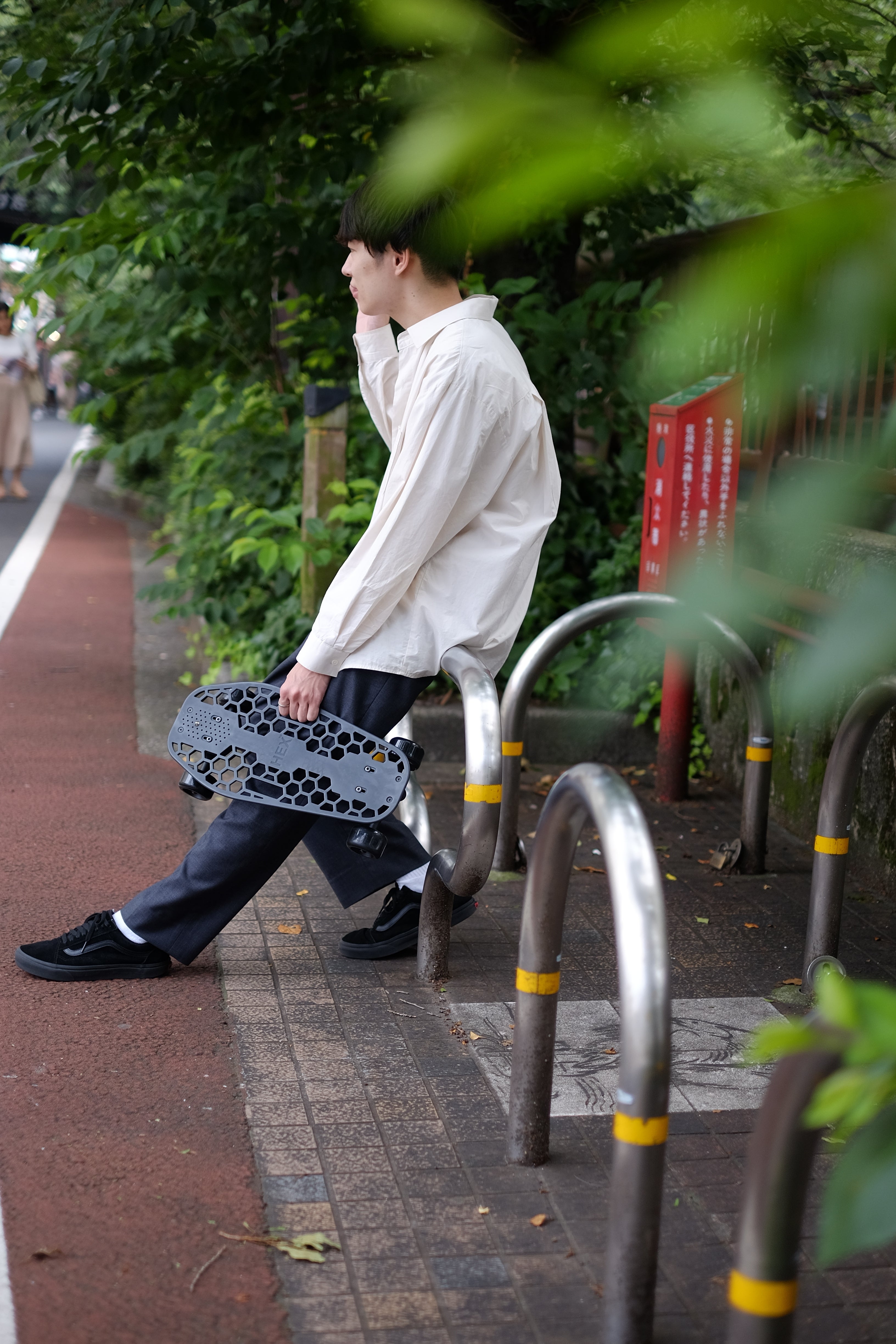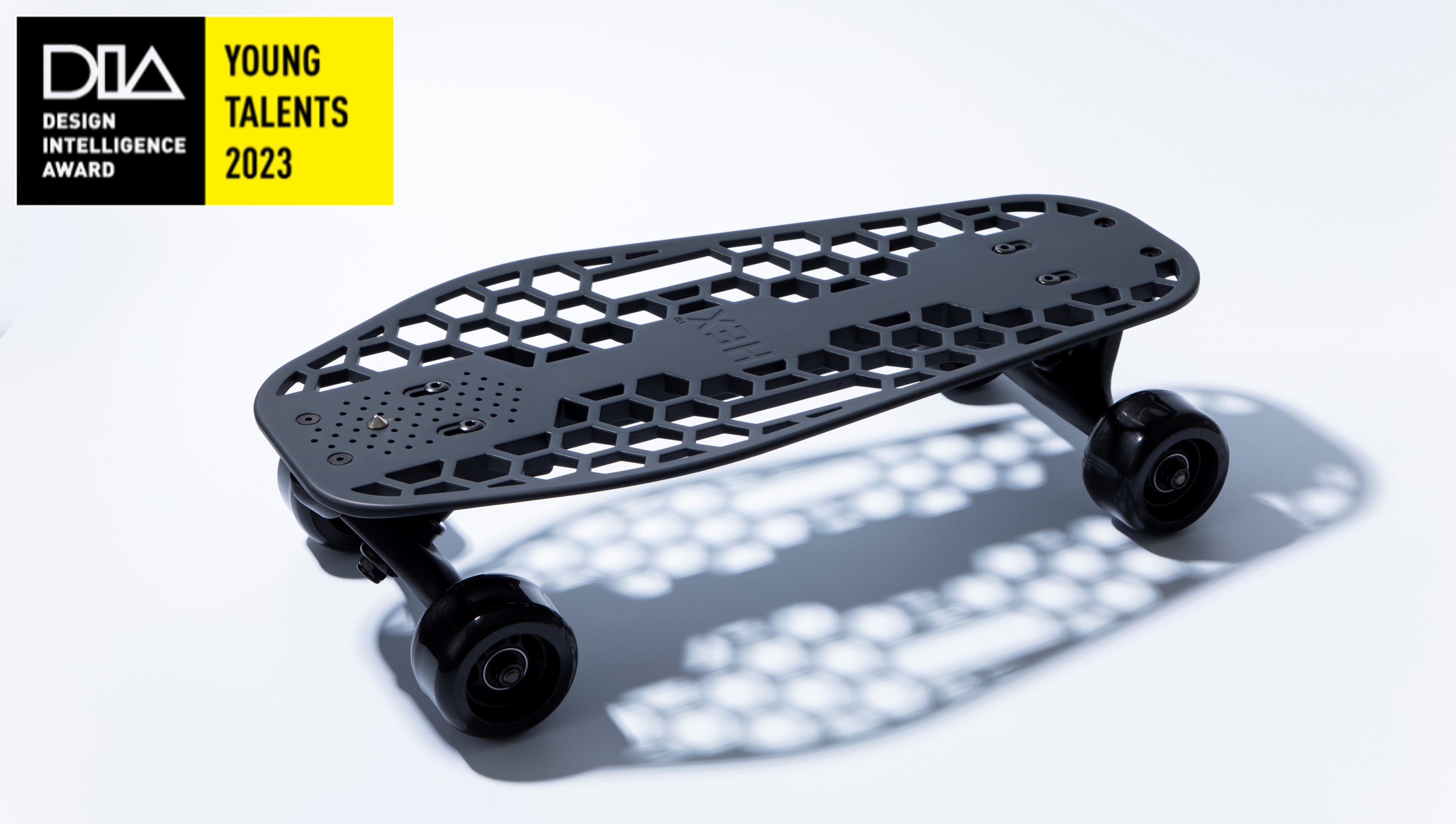 機能テストの評価では、「置いた足がぐらぐらしないから乗れそう!」と一般のスケートボードに立つことに怖さを感じていた人でも、HEX試作品ではデッキの上にすぐ立ってしまい、予想以上の反応であることが確認できました。この構造は、調査した範囲では世の中になかったため特許申請をすることにしました。軽いけどガンガン使いたい思いがあり、プロトタイピングを何度も繰り返して量産の形状を決めました。大人が気兼ねなく使えるデザインを目指してシンプルなフォルムにこだわってデザインしています。