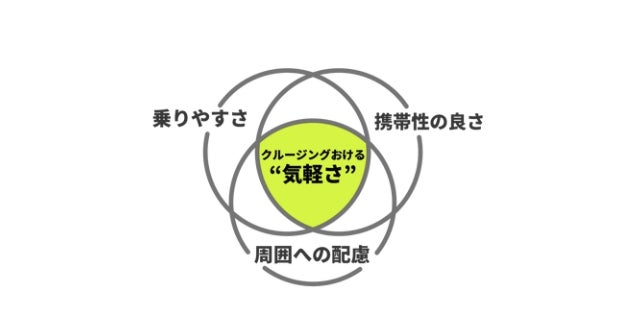 そこで、これらの課題を解決するためスケートボードを1から見直し、持ち運びやすく大人が乗っても違和感のないデザインで、とにかくバランスが取りやすいスケートボードを開発することにしました。企画にあたり、スケートボードでの移動=クルージングを気軽にするための構成要素を以下の様に定義して企画を開始しました。