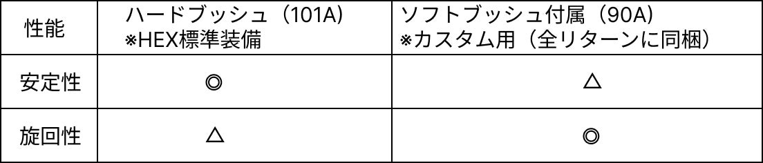 カスタム用のHEX専用メンテナンスツールと乗り心地を変える交換用のソフトブッシュが付属しています。お好みに合わせてカスタマイズできます。