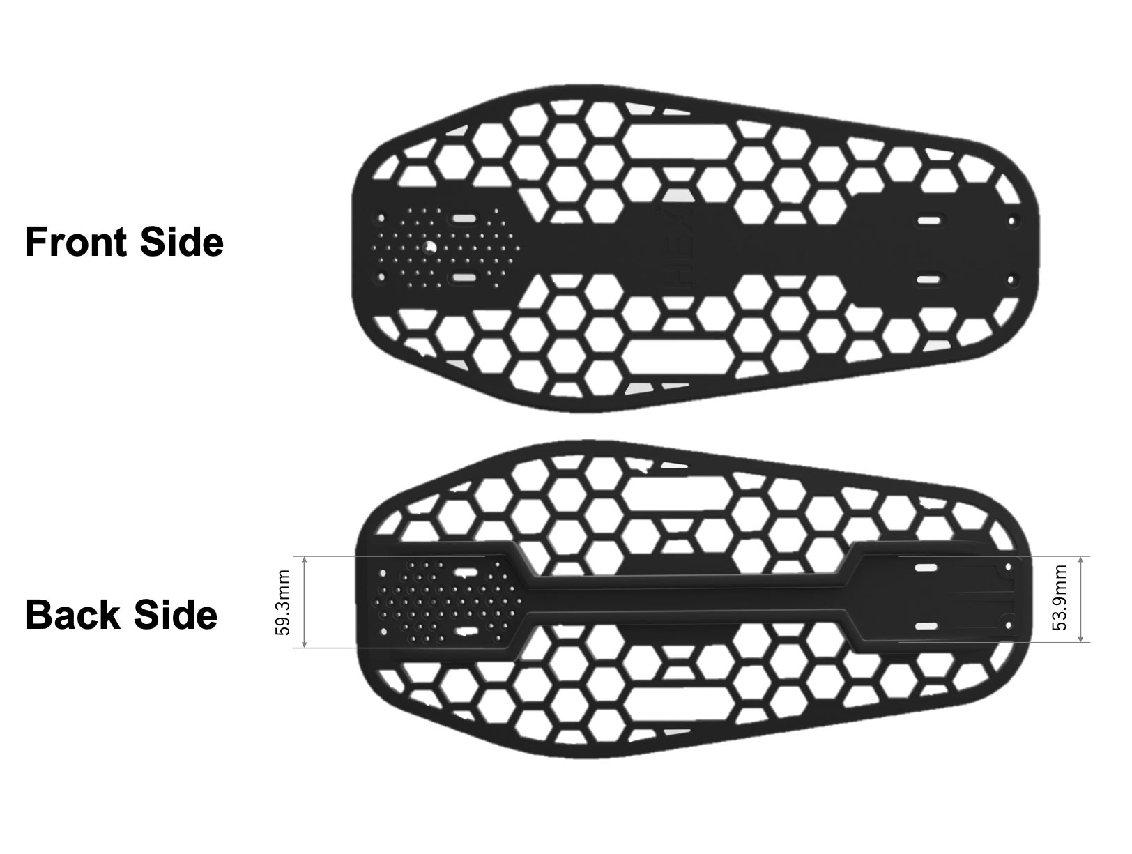 HEXのデッキは、片側に長穴を採用することで主流となっているニュースクールサイズのトラックと、稀に採用されているオールドスクールサイズのトラックの両方に対応しております。デッキとトラックを繋げるボルトは六角穴付きボルト 3mmを採用しています。デッキ背面には、補強リブがあるため手持ちのトラックをつける場合に干渉して取り付けられない場合がございますので、詳細は画像をご確認ください。