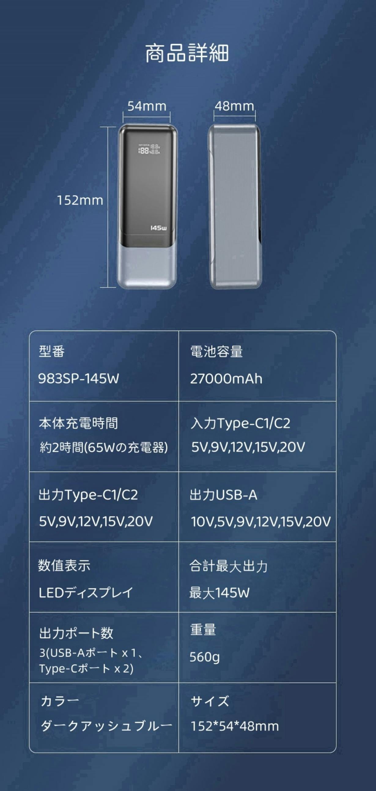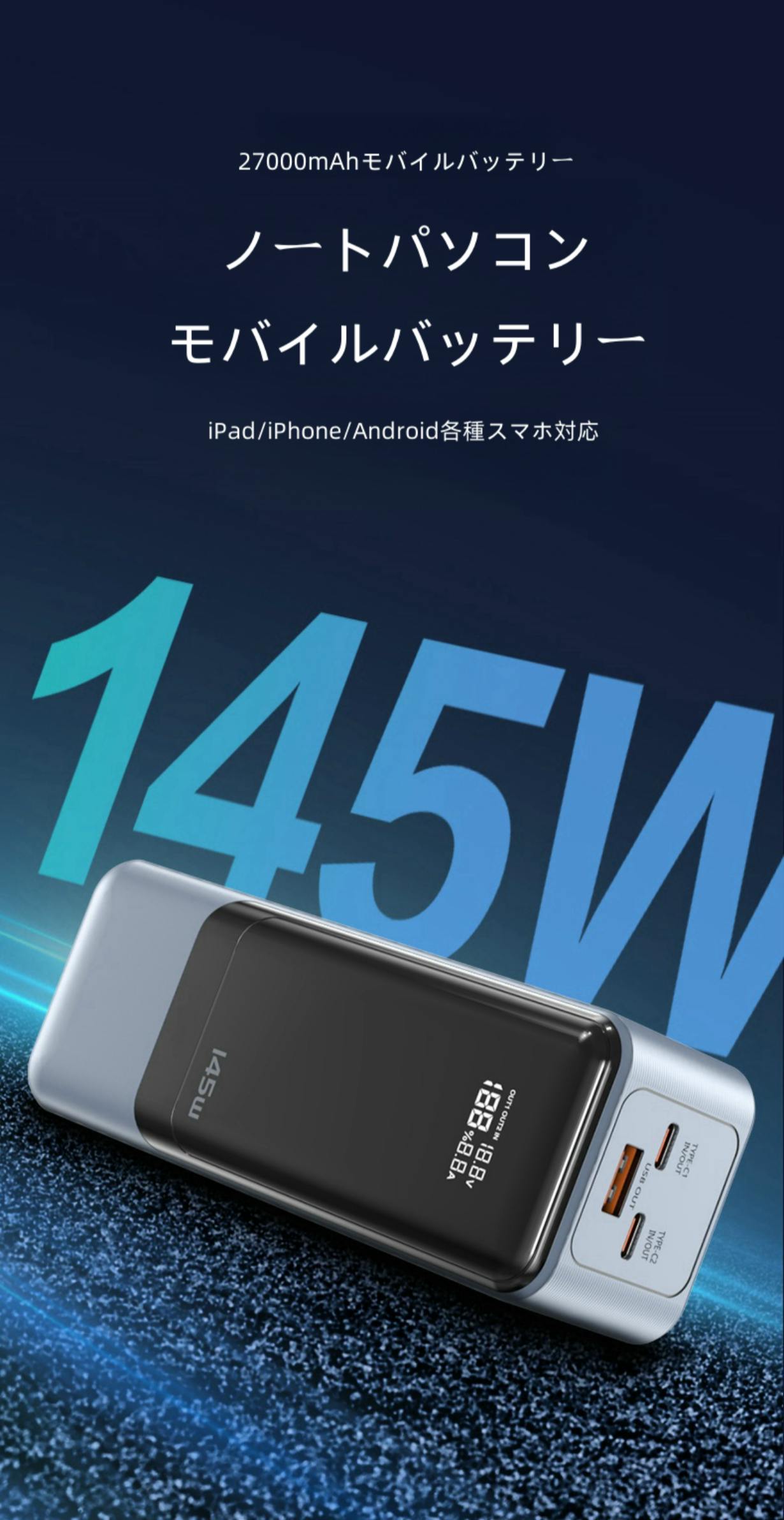 アウトドアでの活動をより快適に、安心して楽しむために、大容量の27000mAhバッテリーを搭載したポータブル電源を開発しました!この製品は、最大出力145Wを誇り、単ポート利用時でも最大100Wの出力を実現します。また、LEDデジタルインジケーターを搭載し、電力残量、電圧、および電流をリアルタイムで確認できるので、使いやすさも抜群です。
