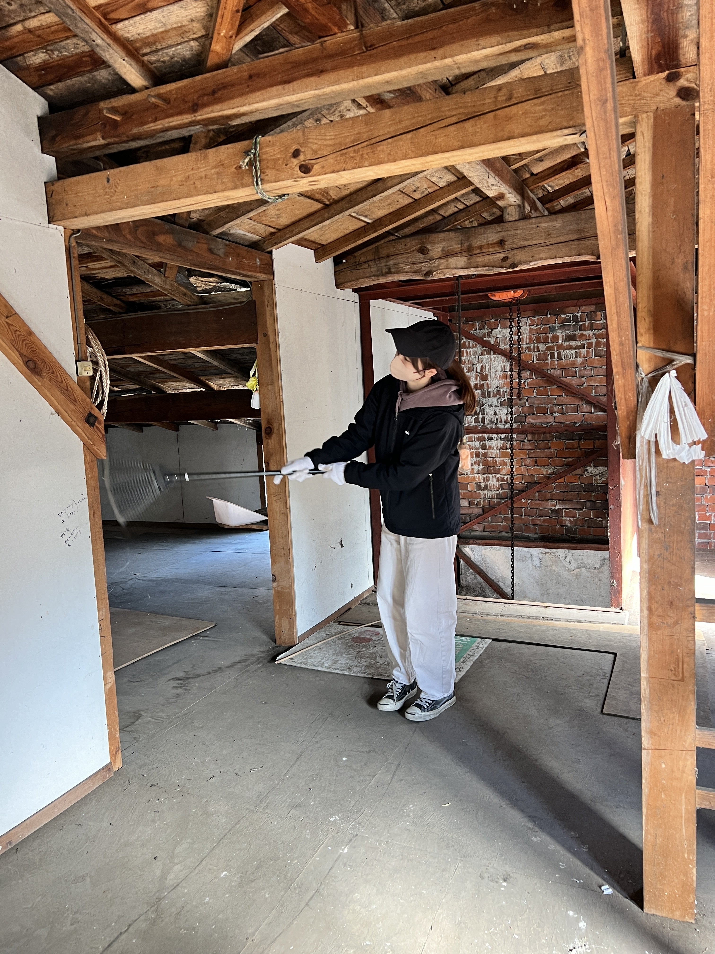 土埃にまみれながら2階のお掃除。まずは自分がここでデスクワークをできるような環境を目指しています!