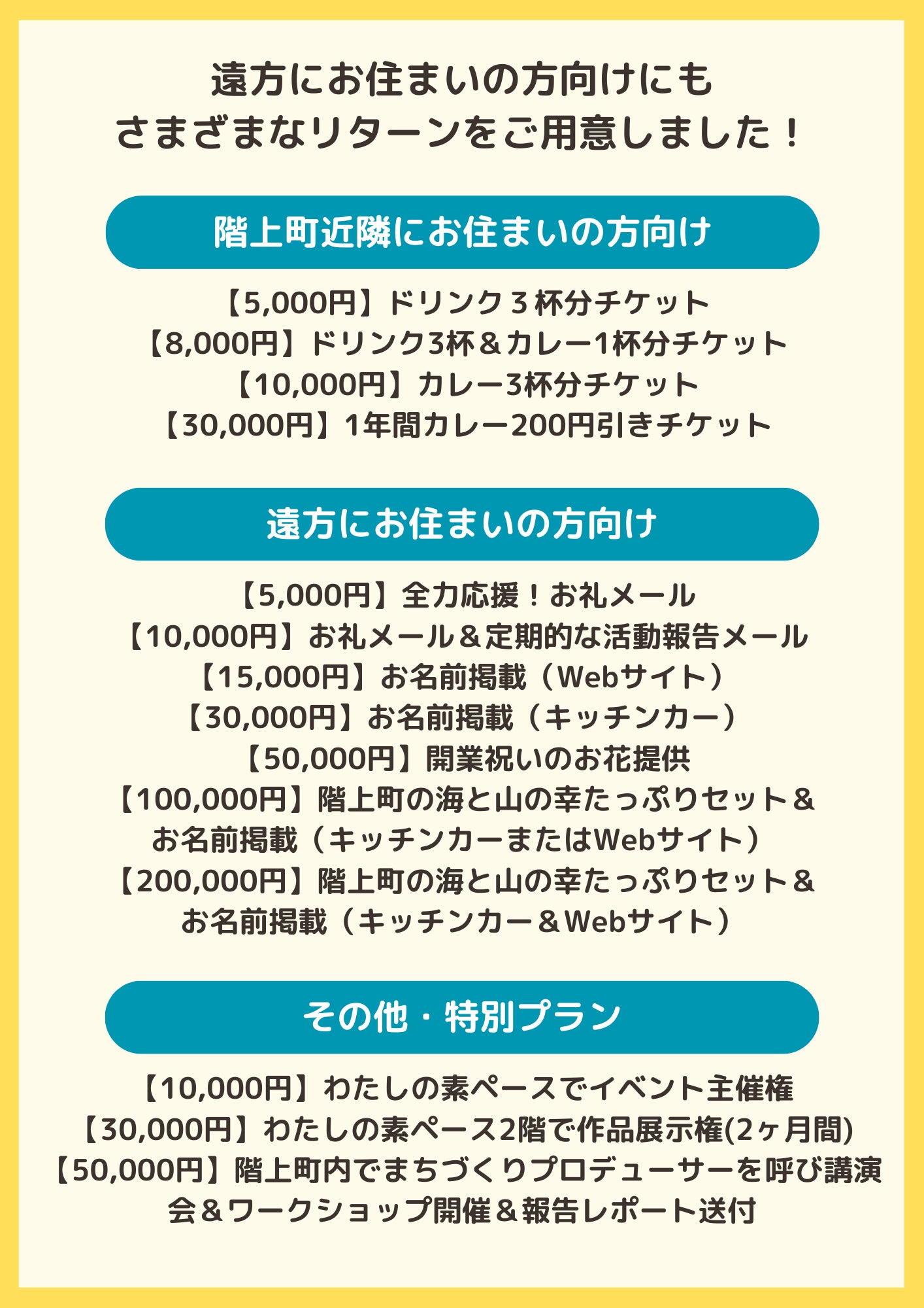 支援金額に応じて、以下のリターンをご用意しております。