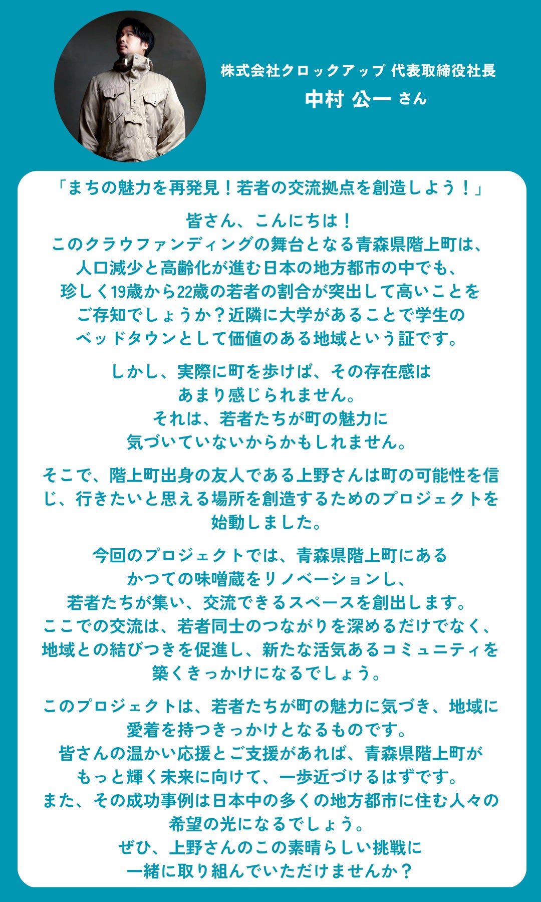兼ねてより構想していた地元・階上町(はしかみちょう)での始まりの拠点づくりを本格スタートさせるべく、今回クラウドファンディングに挑戦しようと決意しました。