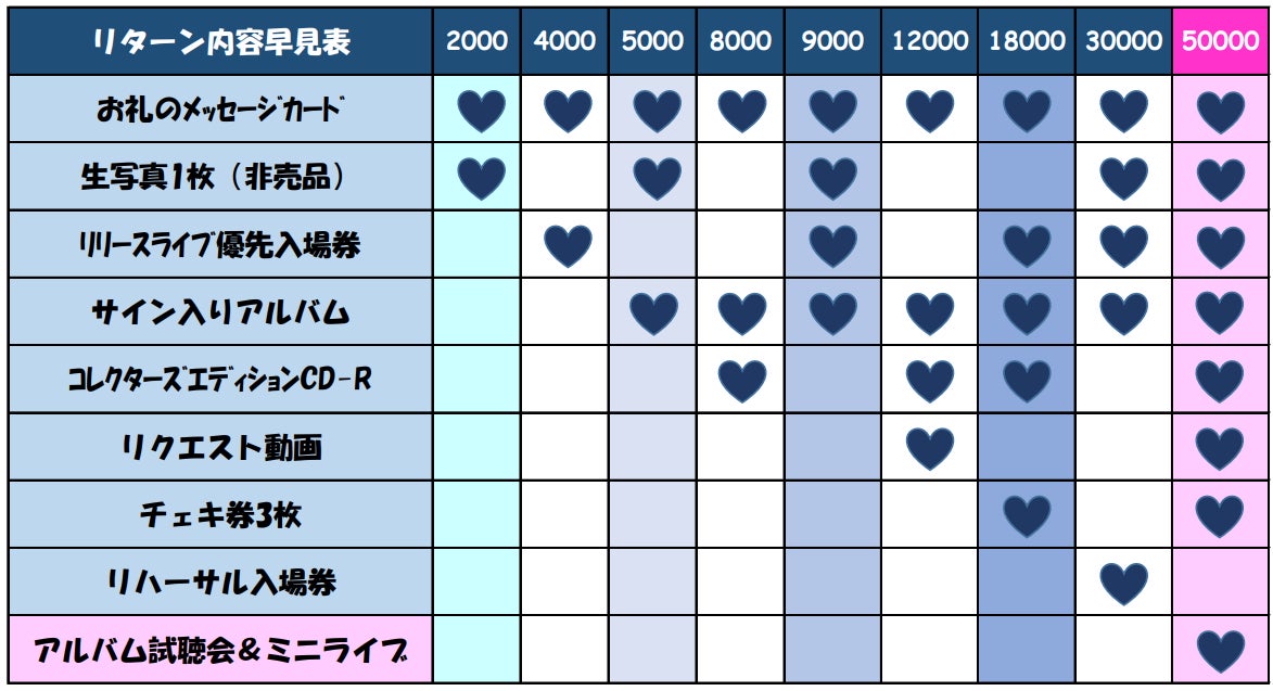 ※リターンの受け取り方法は、郵送とリリース記念ライブ会場での受け取りがお選びいただけます。(この際、ライブ入場券の引換券は先に送付いたします)リターンを選ぶ際、受け取り方法を一緒にご指定ください。