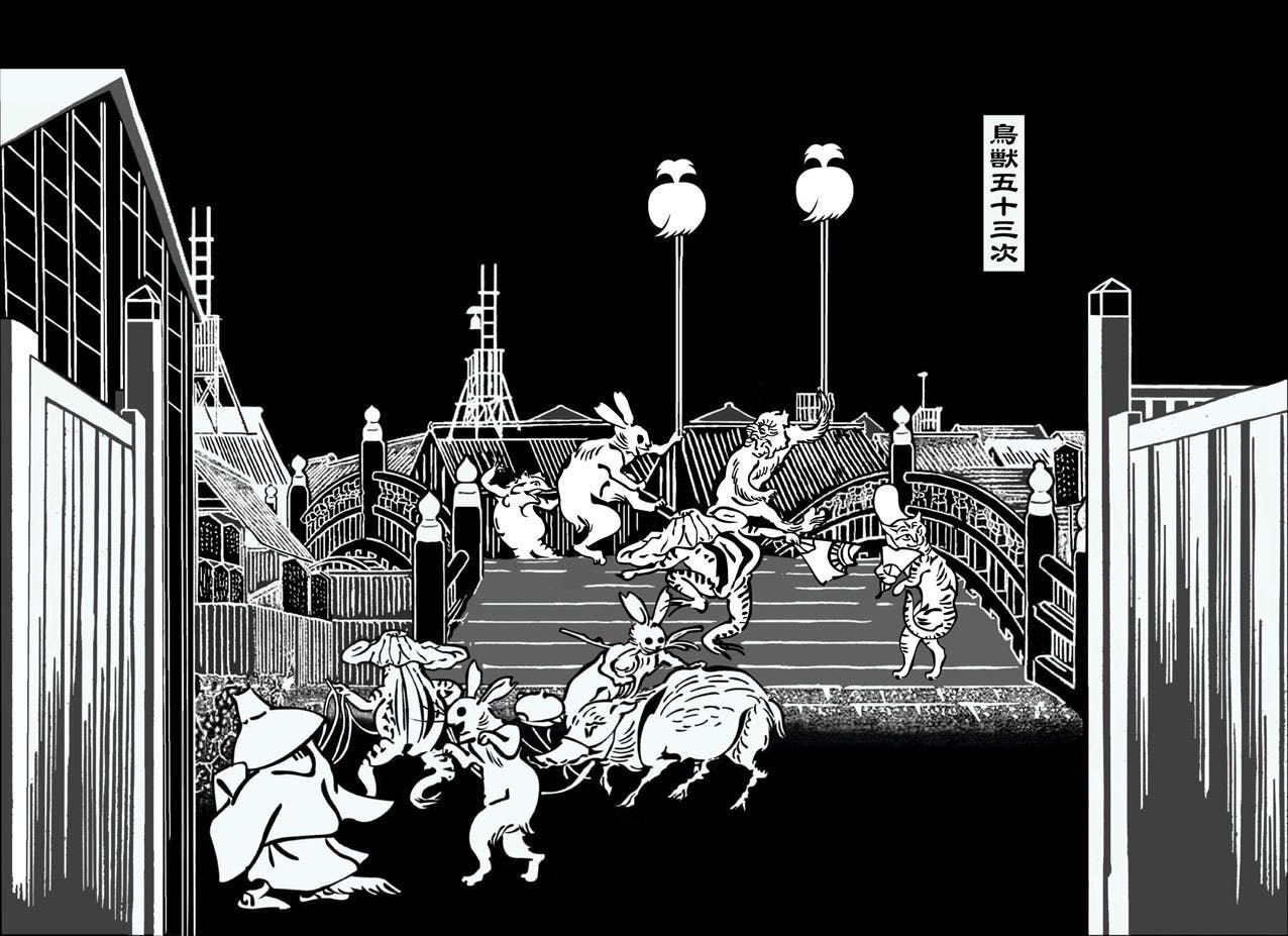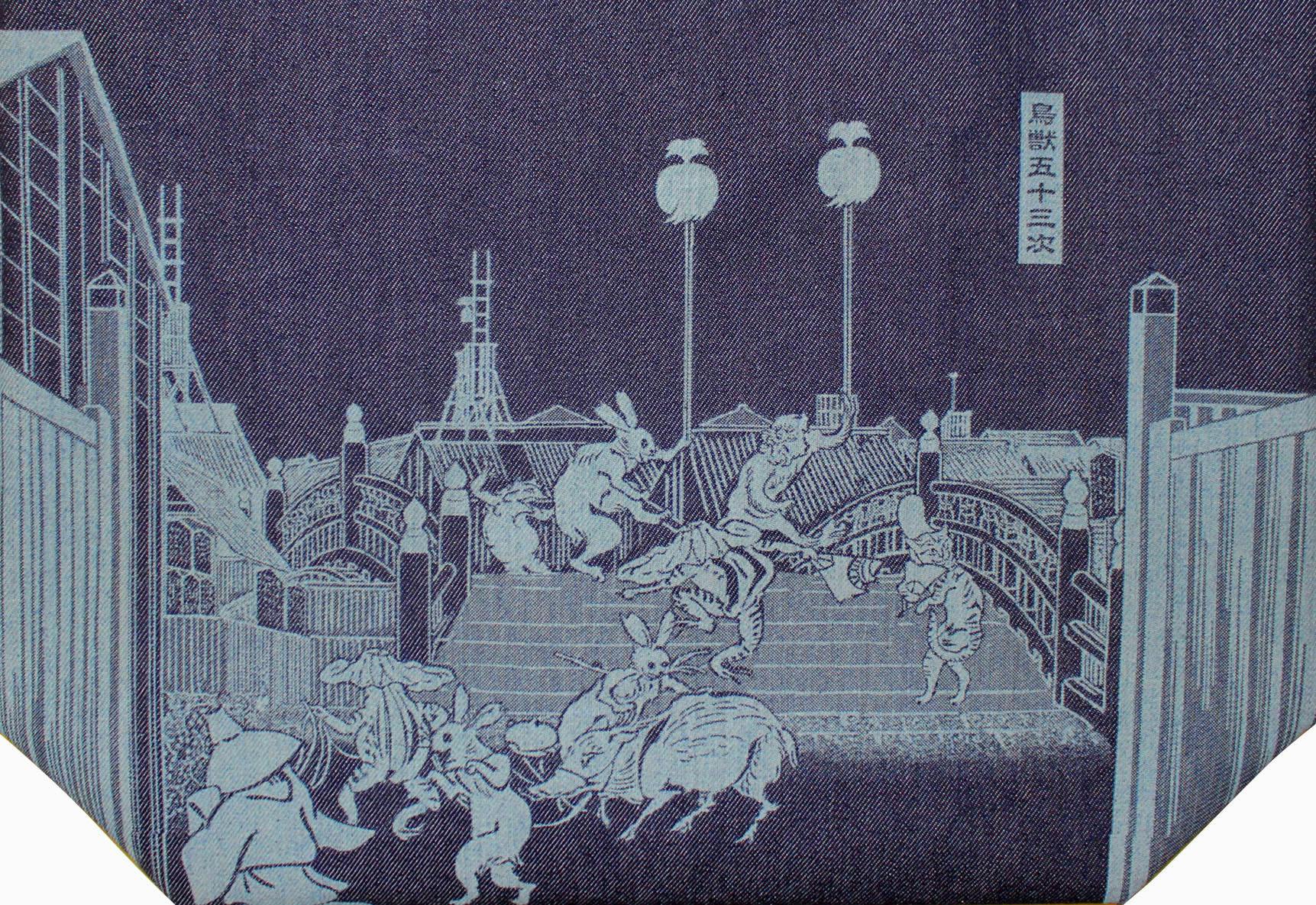 「東海道五十三次之内 日本橋」という図柄を元に、鳥獣戯画を掛け合わせました。