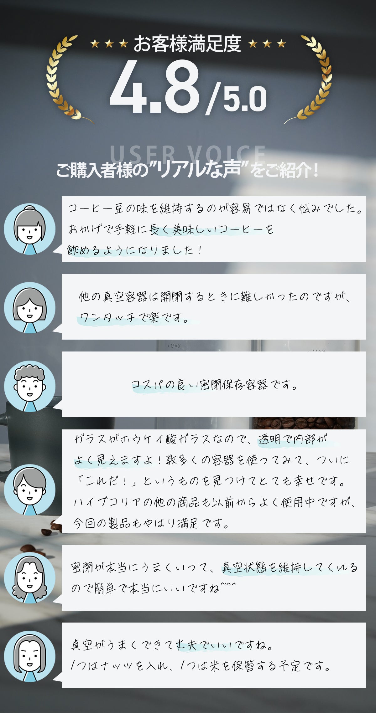シェルブリュの『スマートキャニスター』は最大20kPaで強力に真空状態を保ちます。コーヒー豆だけでなく、野菜や果物、お菓子、米、ナッツ類なども通常保存よりも長く保存することが出来ます。